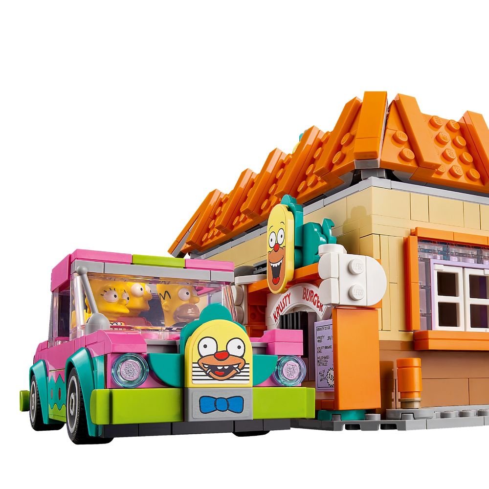 O que vem na caixa – Os Simpsons™: restaurante Krusty Burger, placa de poste, carro de palhaço do Homer e minifiguras de Homer, Bart e Lisa Simpson, Fazendeiro Krusty, Sideshow Bob, Adolescente com Voz Esganiçada e Oficial Lou