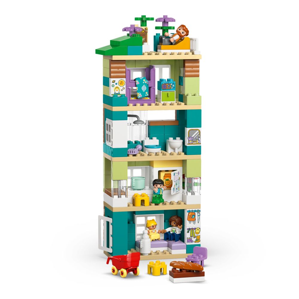 Crianças a partir de 2 anos podem se divertir com brincadeiras imaginativas, explorando a rotina familiar com este kit de construção de casa de bonecas 3 em 1: Casa de Família Moderna com Figuras (10470). Com 4 figuras – 2 pais, uma criança pequena e um bebê – este brinquedo interativo permite que as crianças desfrutem de atividades de aprendizado social e emocional enquanto brincam com a família da casa de bonecas. Este brinquedo versátil que desenvolve a coordenação motora fina oferece muitas possibilidades criativas, já que meninas e meninos podem construir 3 modelos usando o mesmo conjunto de peças LEGO® DUPLO®. Eles podem configurá-lo como um apartamento de um andar ou como uma casa de bonecas de 3 ou 5 andares com um jardim na cobertura e acessórios como uma espreguiçadeira e um hotel para insetos. Este brinquedo de faz de conta para crianças pequenas inclui muitos acessórios de casa de bonecas que as crianças reconhecerão de suas próprias casas, como uma geladeira, um vaso sanitário e um carrinho de bebê. Esses recursos inspirarão horas de histórias para as crianças, onde elas desenvolverão a criatividade, aprenderão sobre rotinas e explorarão os diferentes papéis em uma família. Contém 166 peças.