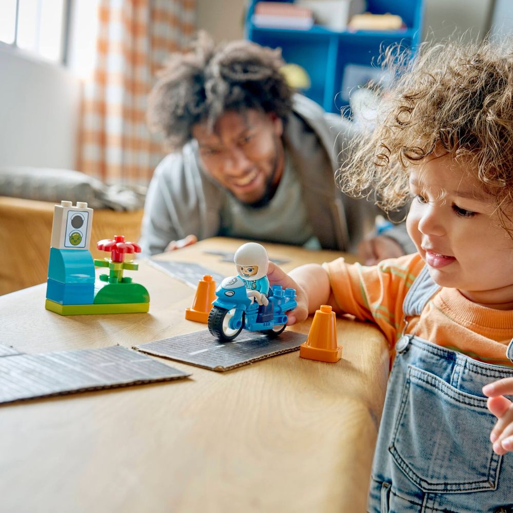 CONJUNTO DE POLÍCIA – Este conjunto LEGO® DUPLO® Town Motocicleta Azul da Polícia (10471) permite que crianças a partir de 2 anos criem histórias emocionantes com uma motocicleta de brinquedo, uma figura de policial, cones e semáforos.