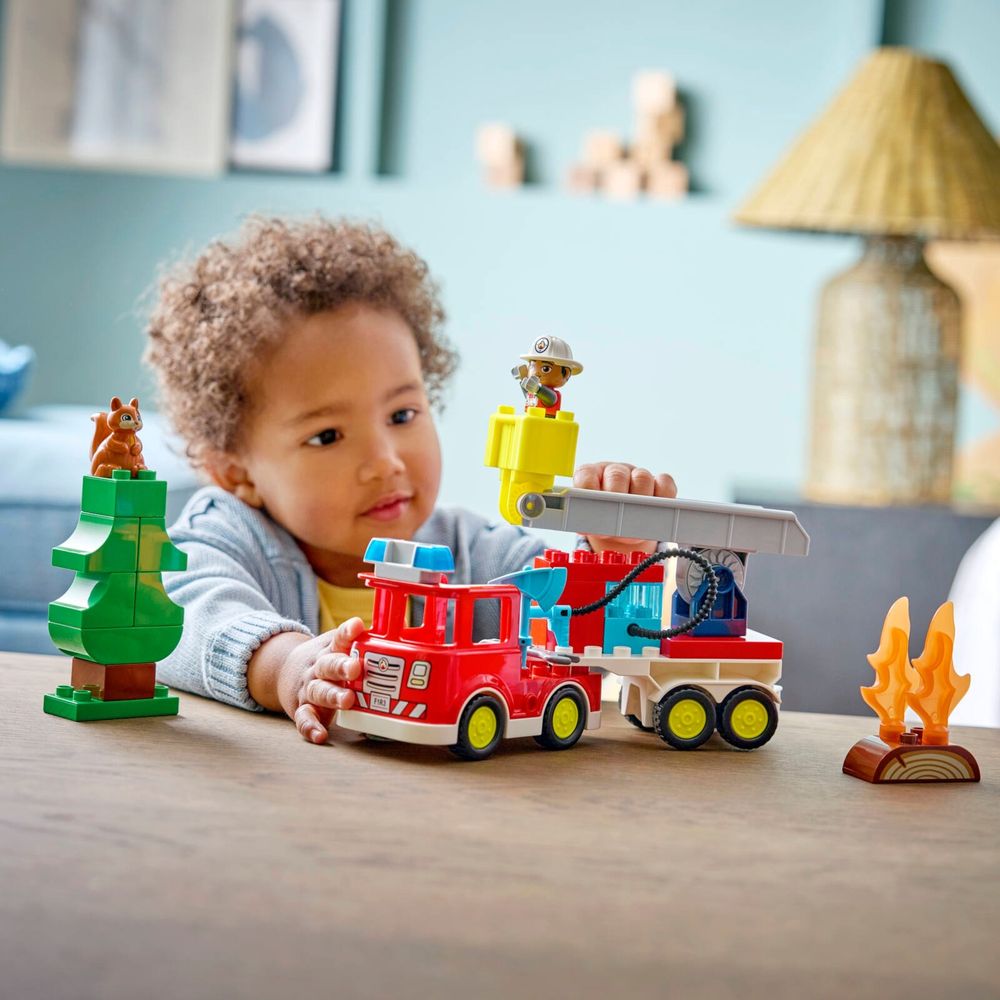 LEGO® DUPLO® BOMBEIRO – Este brinquedo de faz-de-conta permite que as crianças imaginem ser um herói do dia a dia, usando a escada para apagar o fogo na lenha com a mangueira, enquanto um esquilo observa a ação de longe.