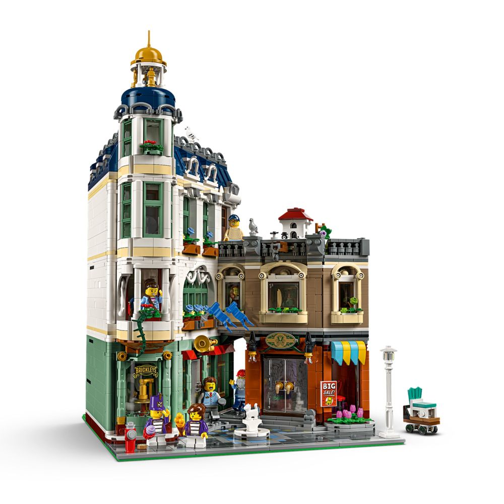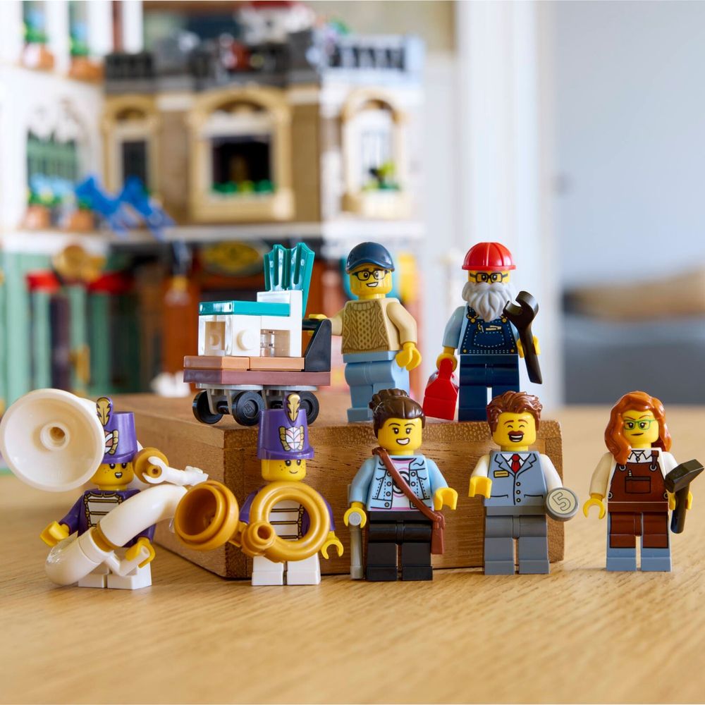 O edifício de 3 andares inclui uma loja de música de 2 andares com instrumentos de banda marcial e uma loja de móveis adjacente completa com balcão, banquetas, mesa e oficina. O último andar abriga um apartamento mobiliado com banheiro, enquanto um jardim na cobertura oferece espaço para vasos de plantas e um pombal. Perfeito para decoração de escritório em casa, este modelo inclui 7 minifiguras e um design modular com fácil acesso ao interior.
