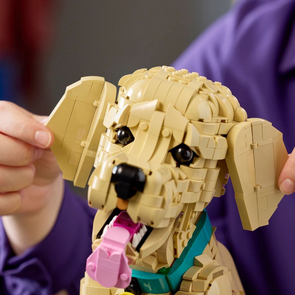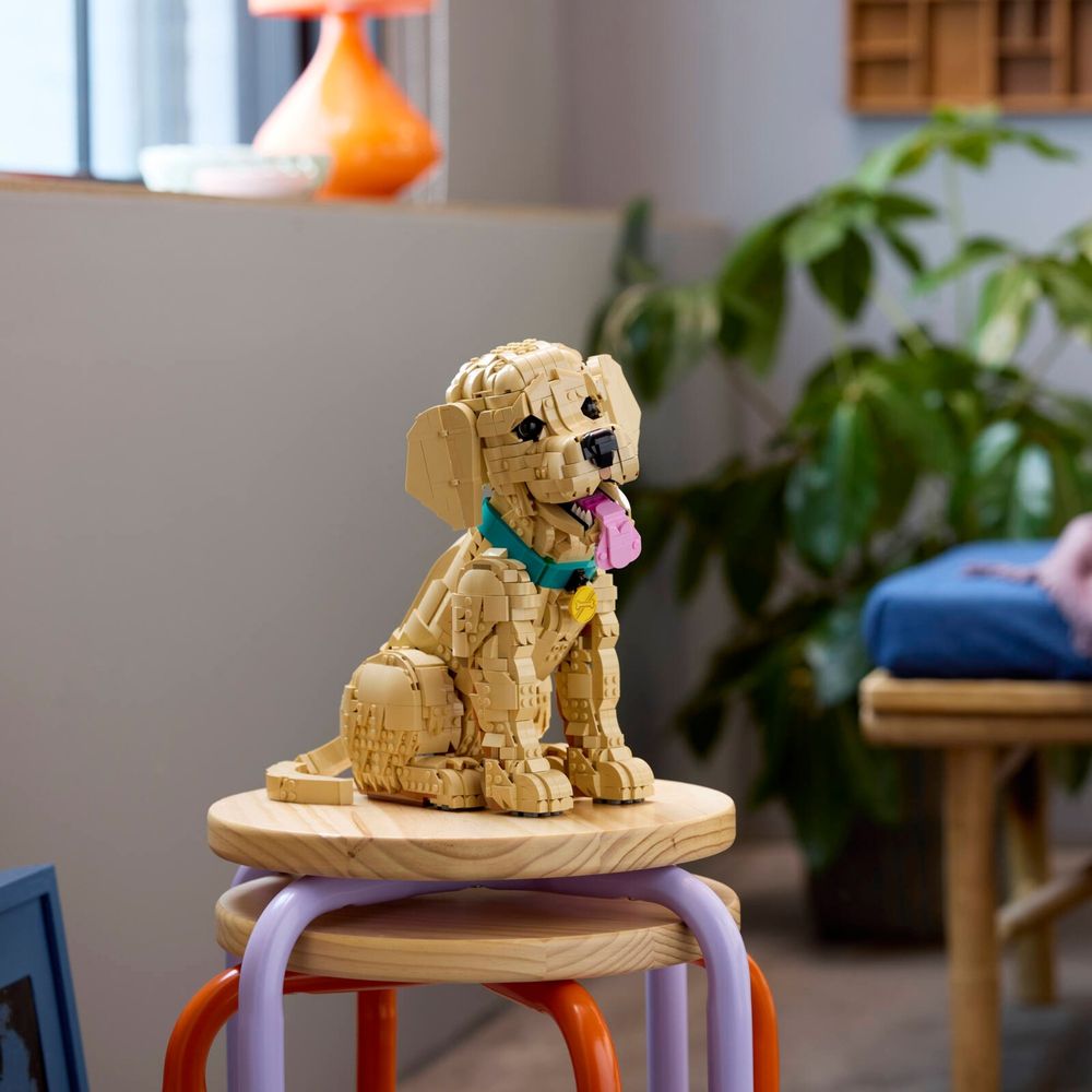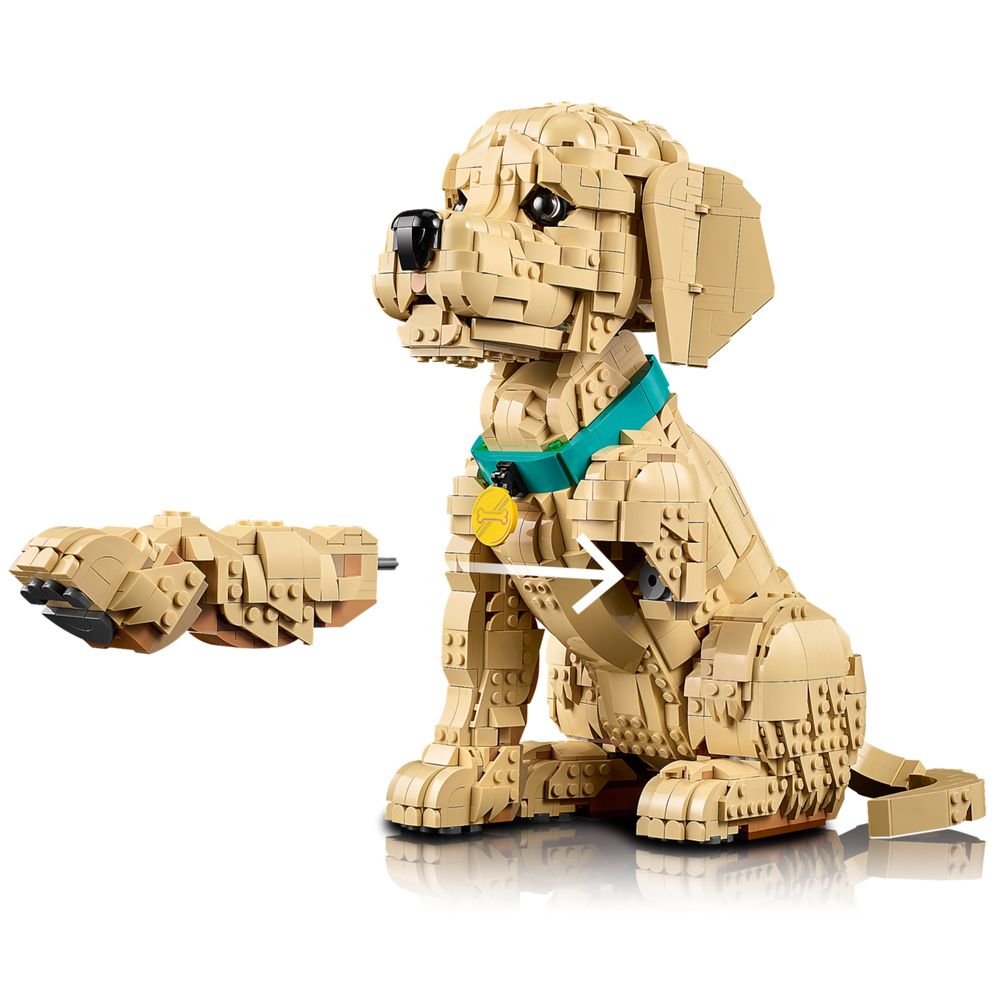 FIGURA ARTICULADA – Crie uma interpretação detalhada em LEGO® de um filhote de golden retriever com coleira e medalhão coloridos e membros articulados para criar poses dinâmicas.