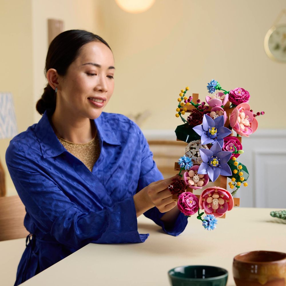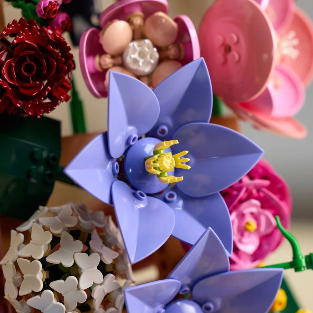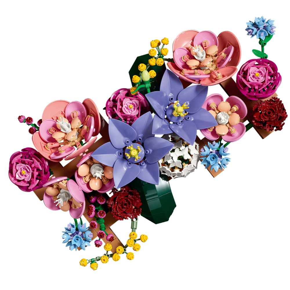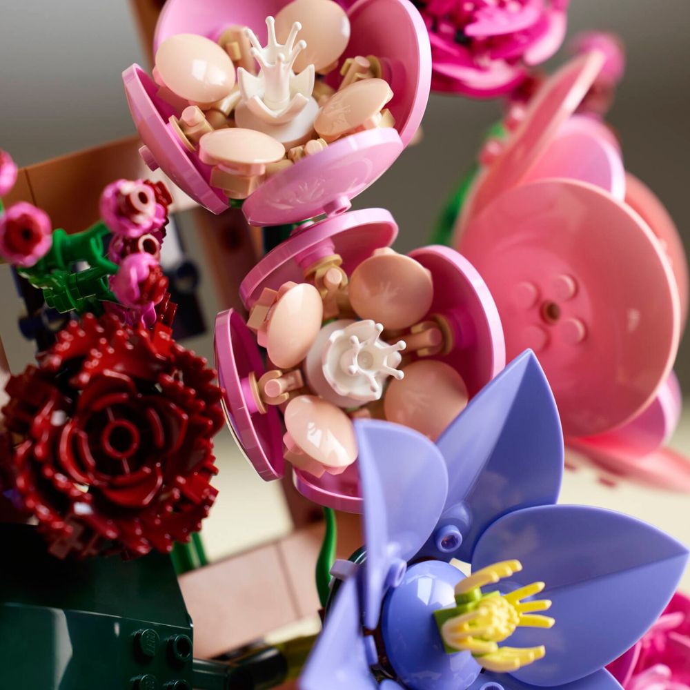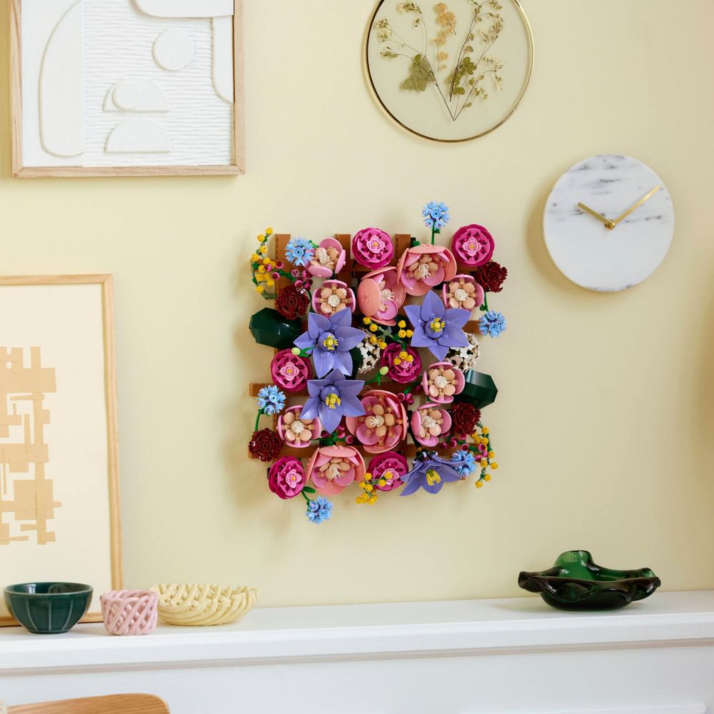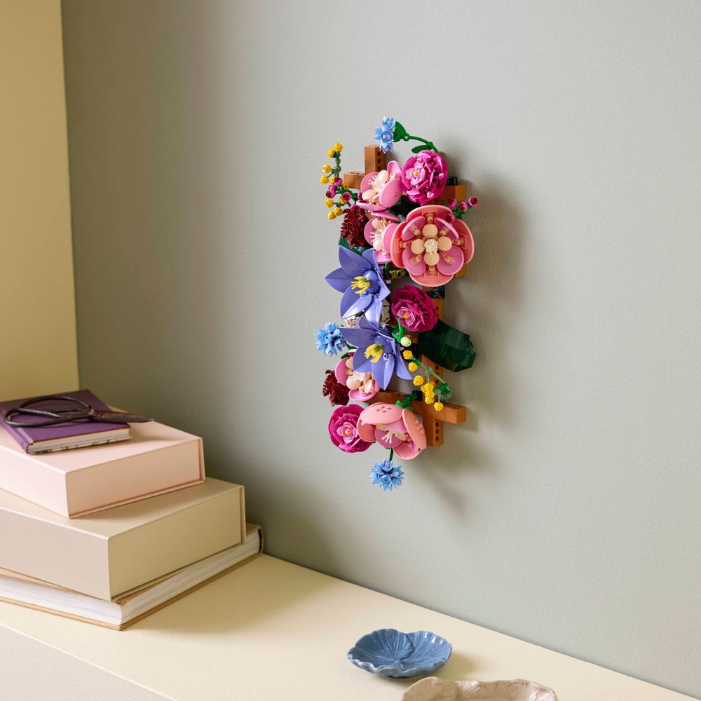 LEGO® FLORES – O conjunto de construção de parede floral inclui clematis, hortênsia, ranúnculos, rosas vermelhas escuras, centáureas e ramos de mimosa.