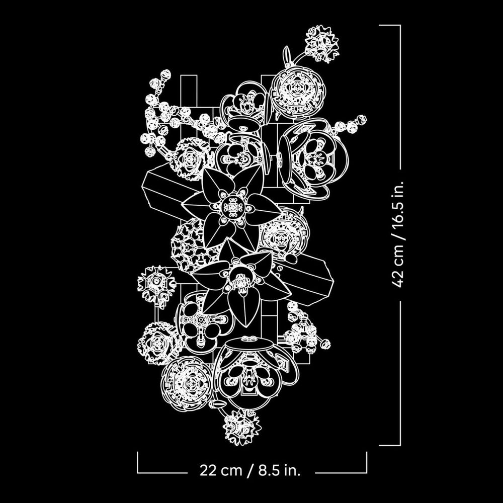 DIMENSÕES – O conjunto LEGO® de flores, com 879 peças, mede mais de 22 cm de altura, 42 cm de largura e 8 cm de profundidade.