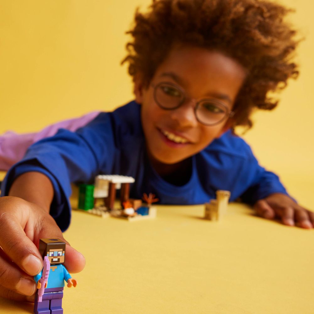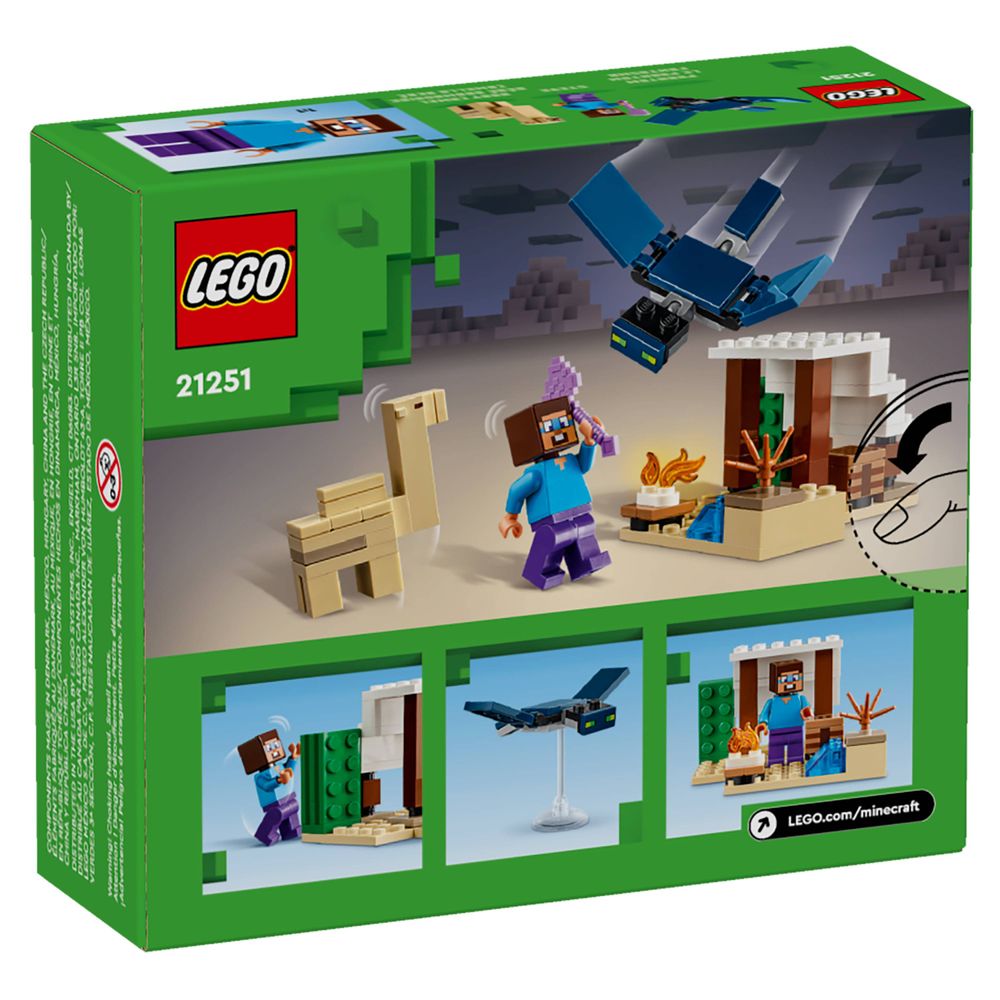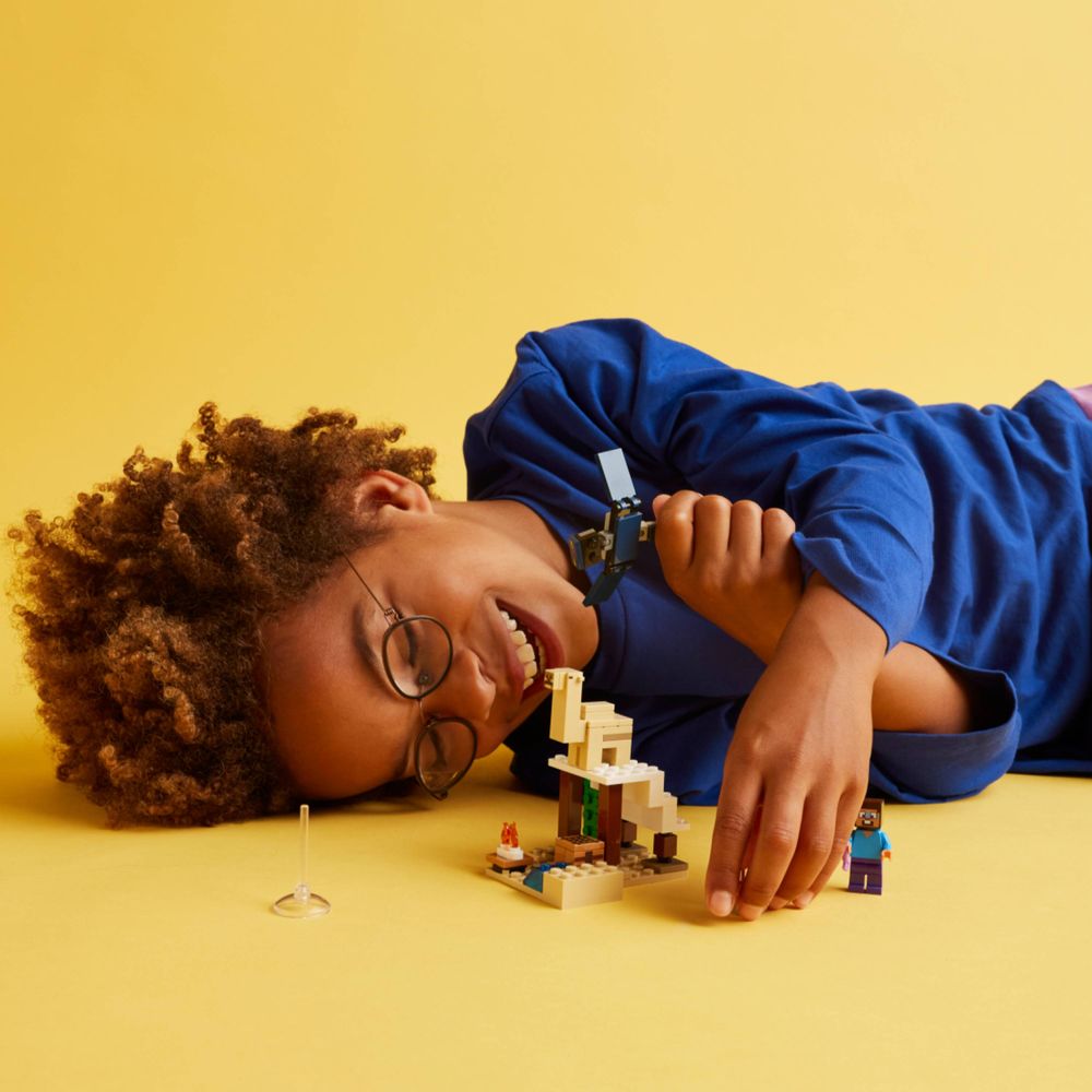 Este brinquedo LEGO® Minecraft® para jogadores com mais de 6 anos é o primeiro brinquedo de construção para crianças localizado no bioma desértico do Minecraft. A Expedição ao Deserto de Steve (21251) desafia as crianças a construir uma casa Minecraft em um ambiente hostil e, em seguida, defendê-la contra o ataque do Fantasma voador.