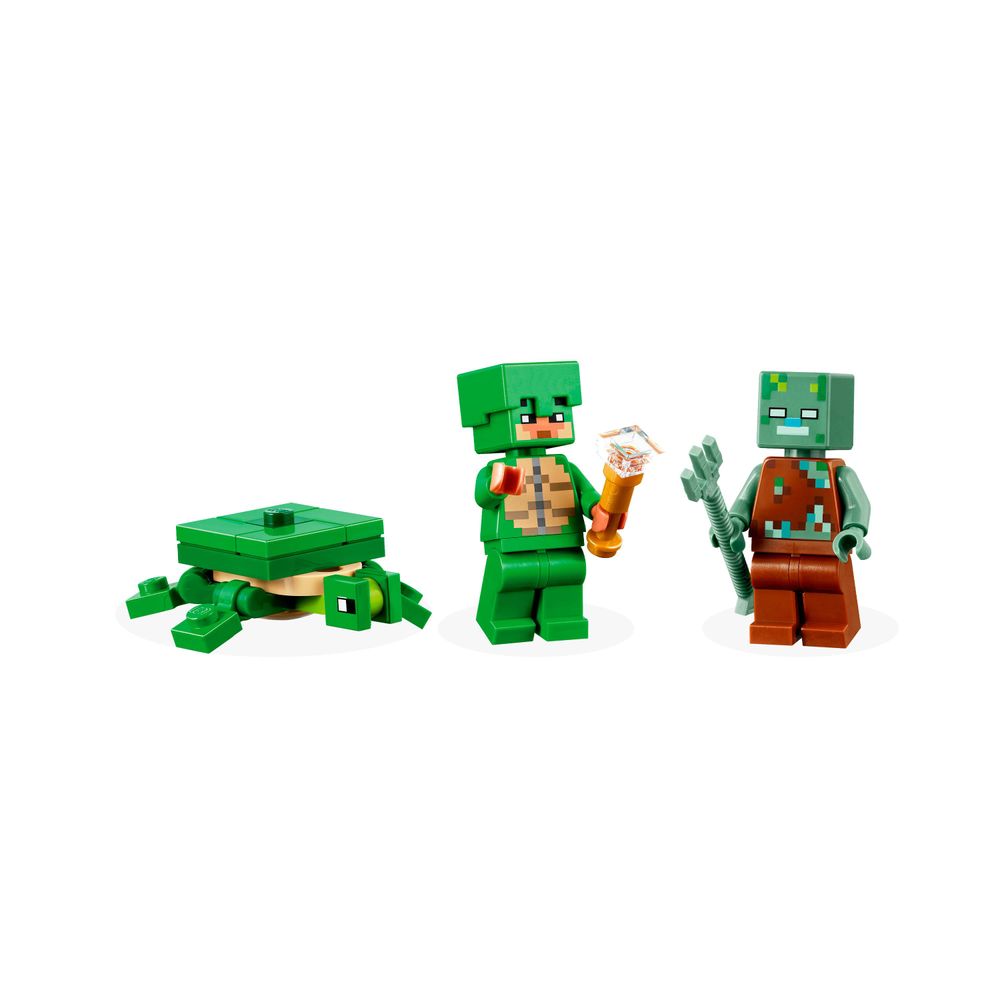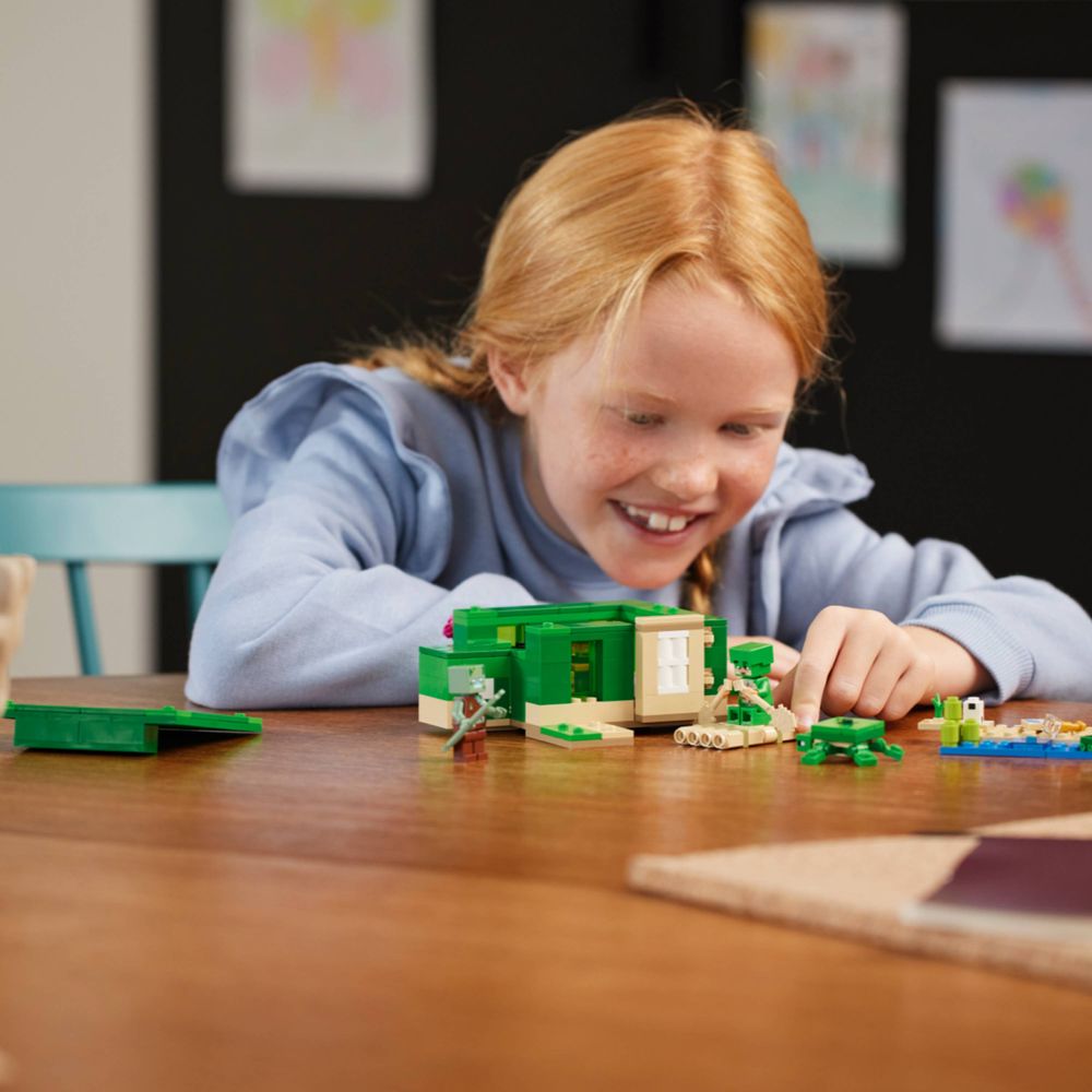 Os jogadores constroem uma casa Minecraft em forma de tartaruga com janelas, lanternas, porta, cama, mesa, mesa de trabalho e fornalha. Um teto removível permite fácil acesso ao interior. Do lado de fora, há uma área de praia com cana-de-açúcar, ovos de tartaruga e uma jangada de bambu com remos. Existem figuras e mobs familiares do Minecraft: um guerreiro de pele de tartaruga com pele de tartaruga e capacete, um afogado com um tridente, uma tartaruga mordiscando ervas marinhas e 3 filhotes de tartarugas. Outros acessórios deste brinquedo para jogadores incluem uma luneta e um mapa. Os fãs de jogos de ação, construção criativa e cuidados com os animais vão adorar este brinquedo versátil. Para diversão digital extra, o aplicativo LEGO Builder permite que os construtores aumentem o zoom, girem modelos em 3D e acompanhem seu progresso.