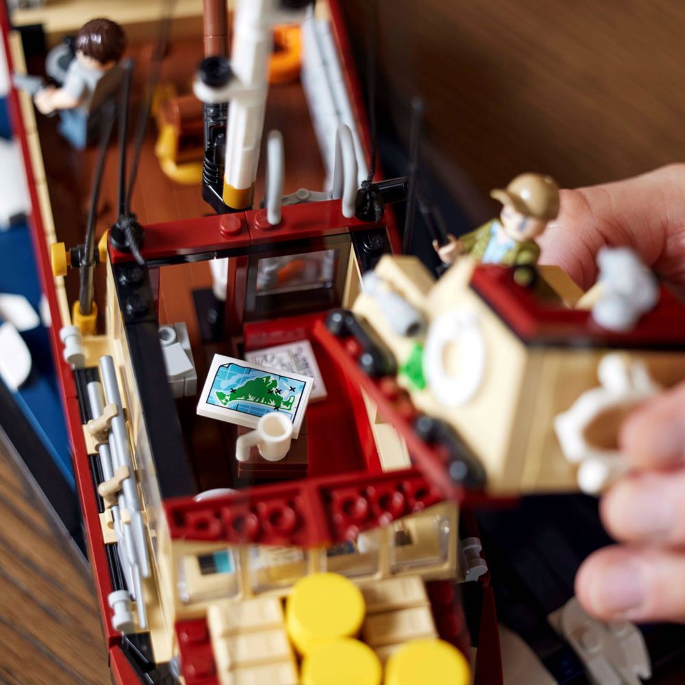Decoração lúdica para a casa – O modelo de barco Orca neste conjunto LEGO® Jaws de 1.497 peças mede mais de 35 cm (14 pol.) de altura, 59 cm (23 pol.) de comprimento e 20 cm (7,5 pol.) de largura