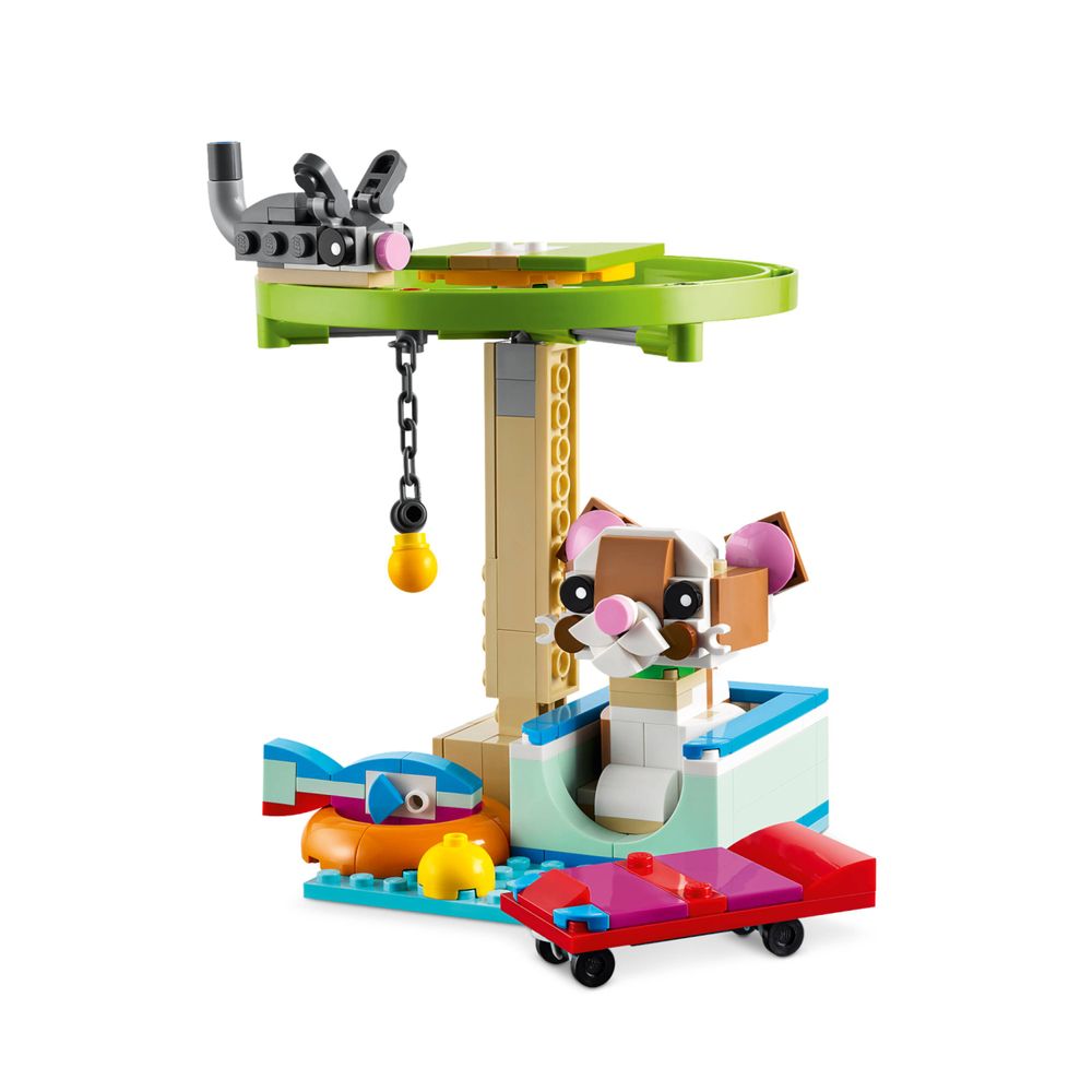 Brinquedos para pequenos animais articulados e interativos – O brinquedo para hamster pode correr em torno de uma roda giratória, o brinquedo para gatos tem cauda e orelhas ajustáveis ??e o brinquedo para cães LEGO® tem rodas integradas para descer uma rampa