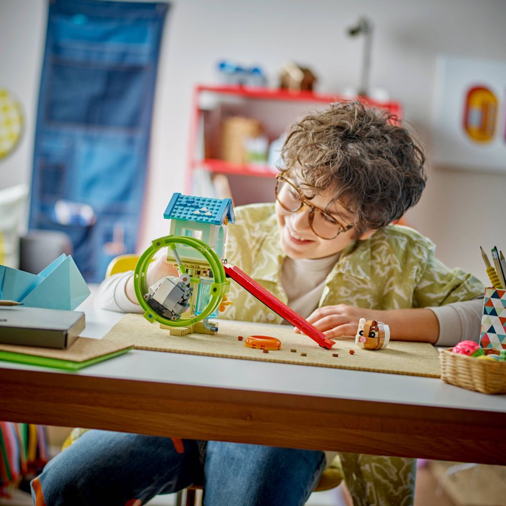Opções de dramatização ininterruptas – As crianças se divertem com histórias com 3 brinquedos de animais diferentes: girar com 2 brinquedos de hamster, uma área de recreação para gatos com conjunto LEGO® com uma roda giratória ou uma casinha de cachorro com um cachorro e seus brinquedos