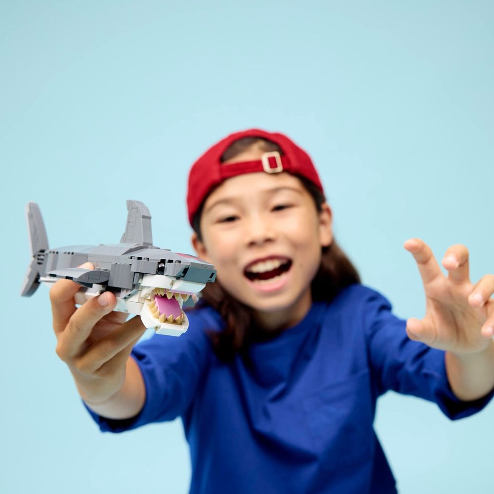 BRINQUEDO DE ANIMAIS MARINHOS 3 EM 1 – O brinquedo de construção LEGO® Creator Tubarão Feroz 3 em 1 com Baú do Tesouro (31381) permite que meninos e meninas a partir de 8 anos construam e reconstruam 3 figuras de animais marinhos com as mesmas peças.