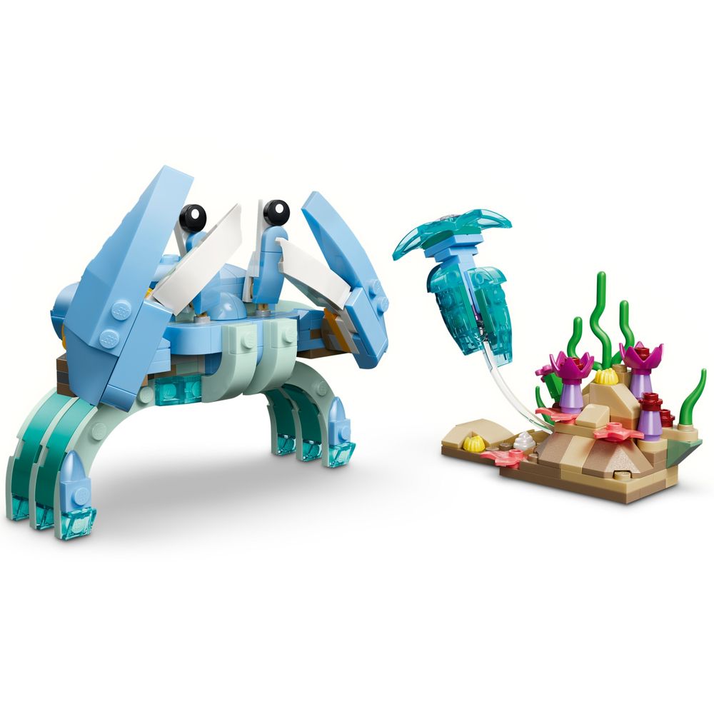 ACESSÓRIOS PARA BRINCAR E EXIBIR – Os golfinhos cavalgam uma onda com corais, o cavalo-marinho está em um suporte com algas marinhas e uma concha articulada, e o caranguejo vem com uma água-viva e plantas marinhas.