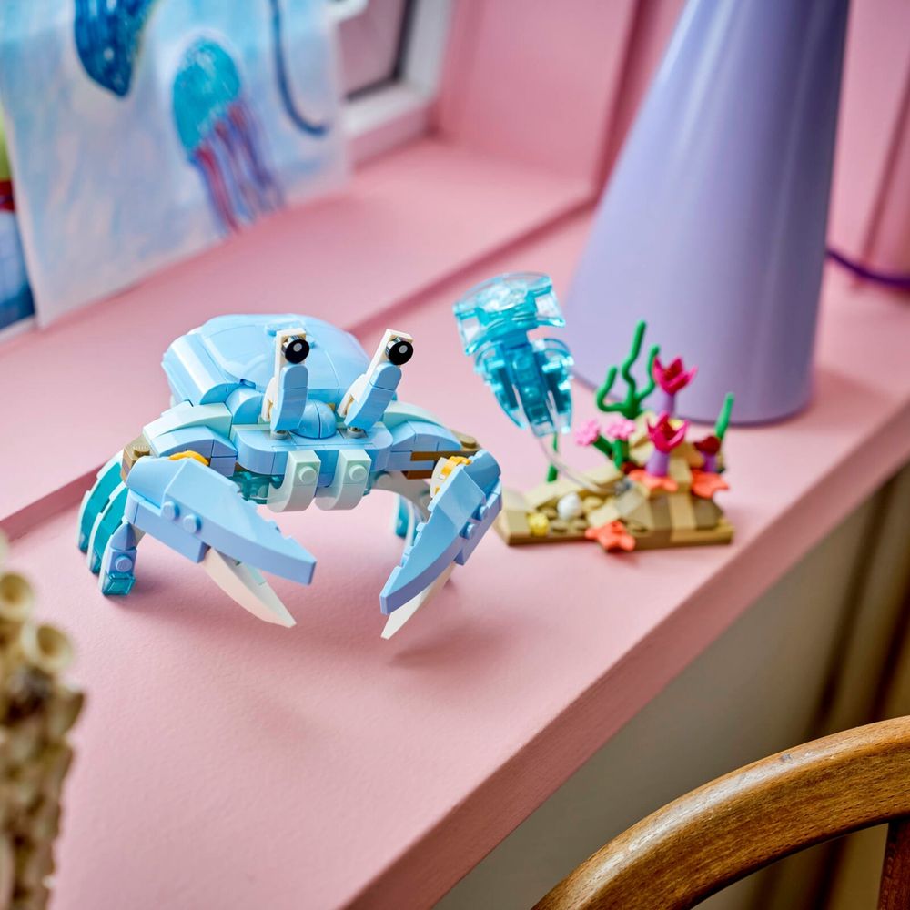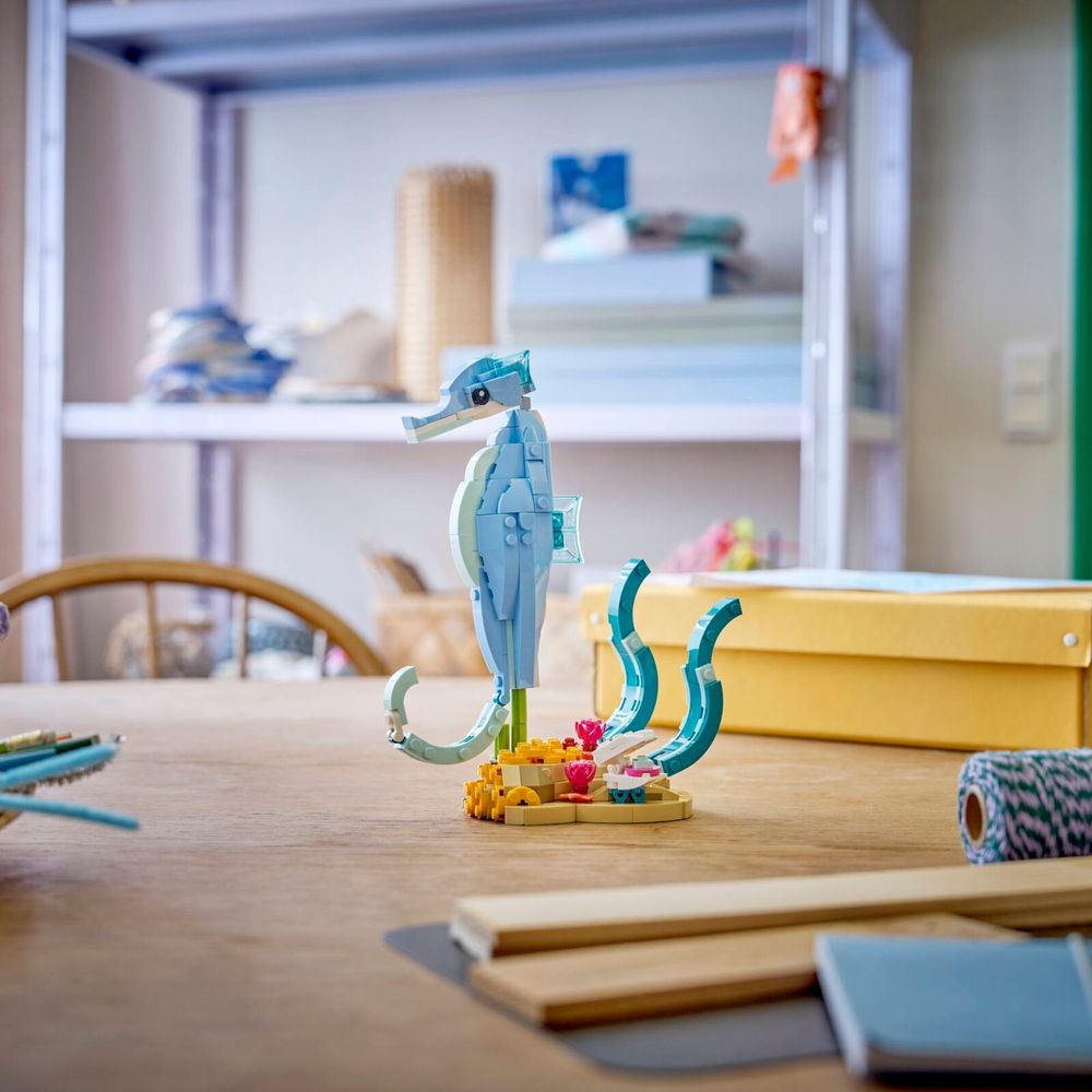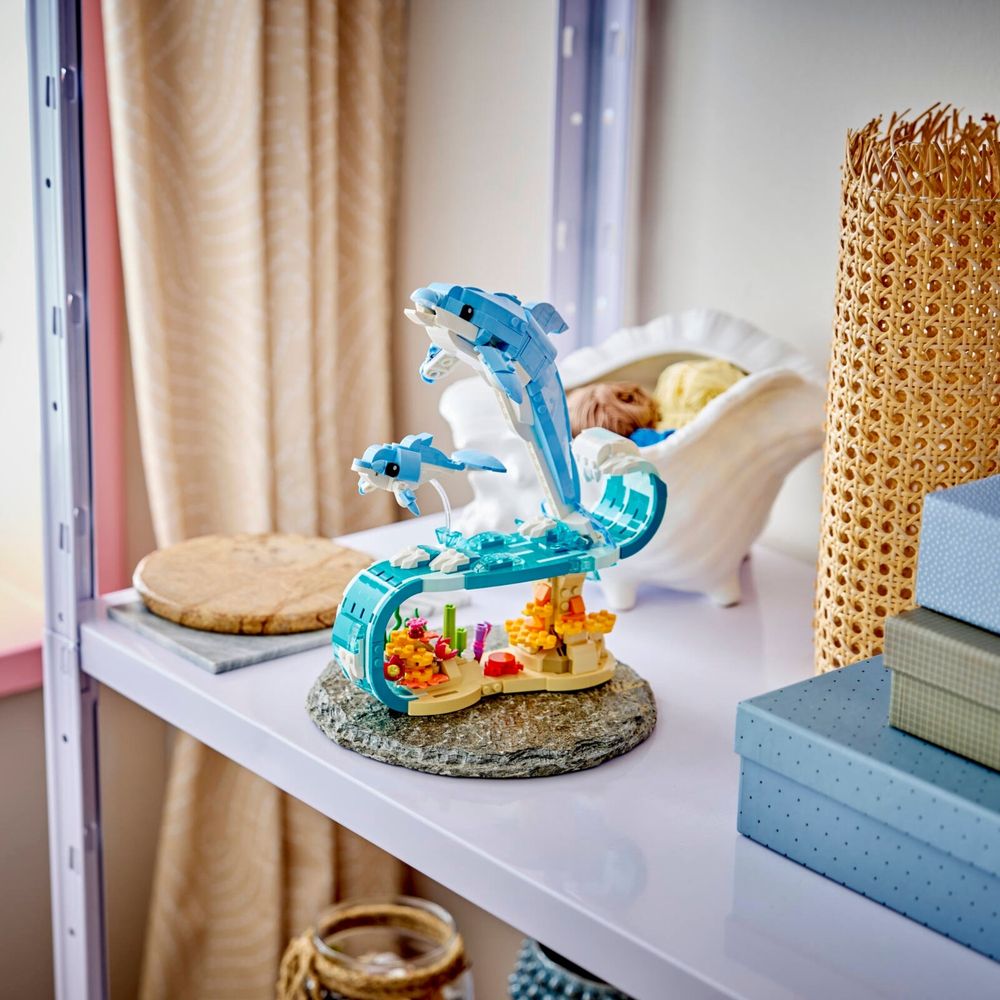 O conjunto de construção LEGO® Creator 3 em 1 Animais Marinhos: Lindos Golfinhos (31385) permite que crianças a partir de 9 anos criem histórias divertidas. Este conjunto de figuras de animais marinhos para meninas e meninos oferece 3 opções de construção diferentes com o mesmo conjunto de peças. Elas podem optar por construir um modelo dinâmico de um golfinho adulto e um filhote com articulações, surfando uma onda acima de um coral. Este modelo pode ser reconstruído em um cavalo-marinho articulado em um suporte colorido com algas e uma concha articulada, ou um caranguejo ao lado de plantas marinhas e uma água-viva. Após a brincadeira, cada modelo pode ser exibido com orgulho como uma bela decoração com tema da natureza em uma prateleira ou mesa. Este conjunto LEGO Creator 3 em 1 inspirará a imaginação dos jovens e é uma ótima ideia de presente para crianças que amam animais marinhos. Elas podem construir cada conjunto com confiança usando o aplicativo LEGO Builder – dê zoom, gire em 3D e acompanhe o progresso com instruções digitais fáceis de seguir. Observe que os modelos não podem ser construídos simultaneamente. O conjunto contém 542 peças.