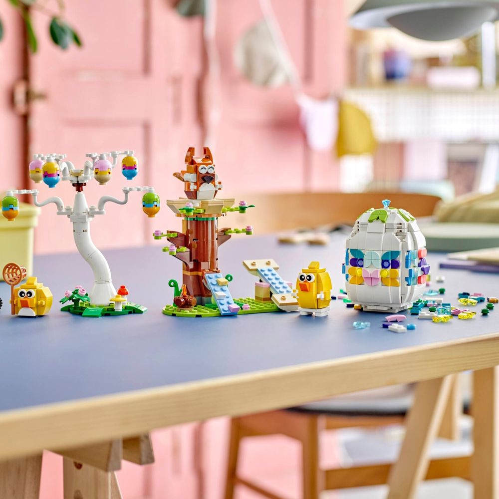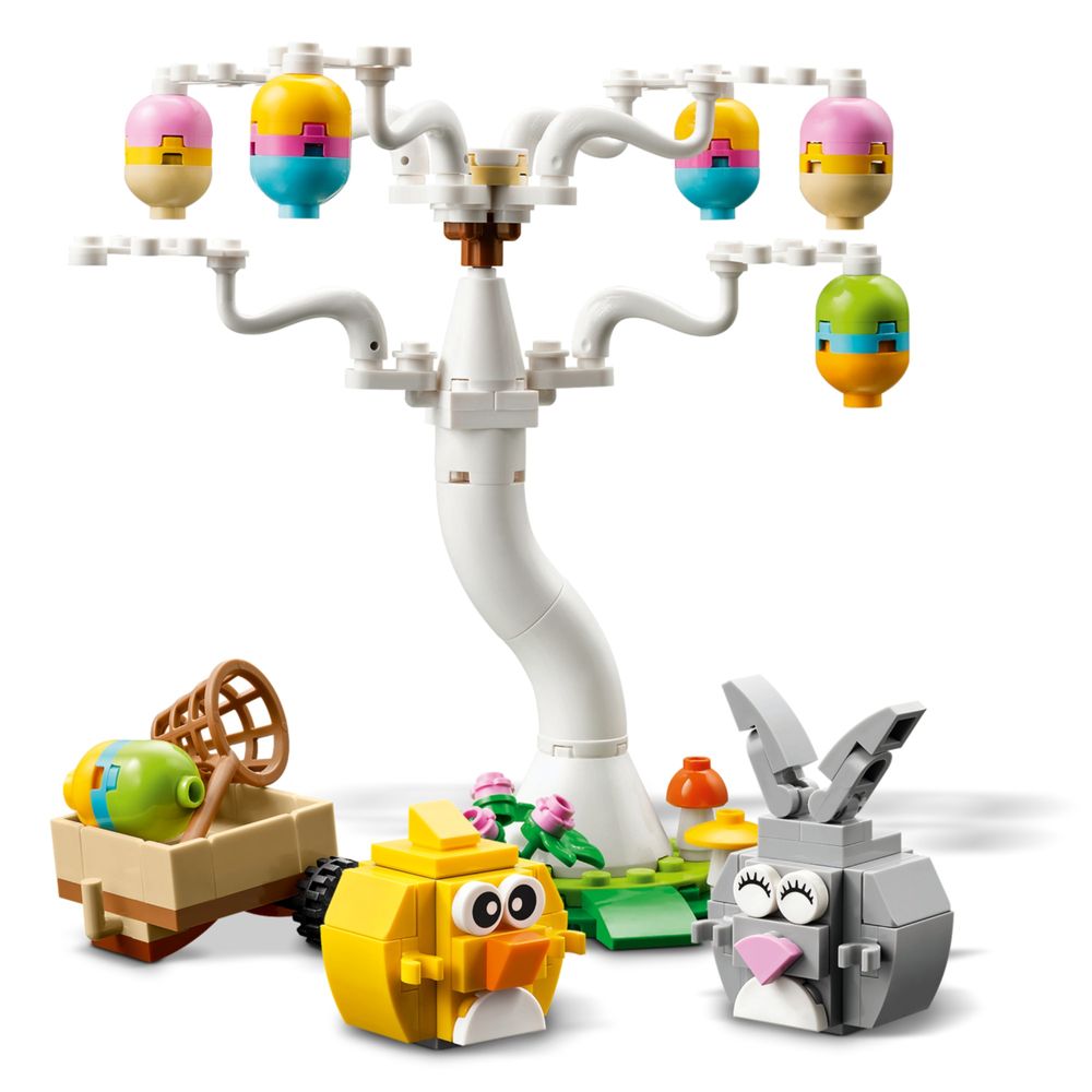 O kit de construção é um presente de Páscoa divertido para adultos, crianças e amantes de animais, bem como um conjunto ideal para a família ou amigos construírem juntos. Monte a árvore, o vagão, o brinquedo de pássaro LEGO e o brinquedo de coelho, depois construa e prenda os ovos coloridos aos galhos da árvore para os animais encontrarem. Ajude o pintinho e o coelho da Páscoa a coletar os ovos usando a rede e armazene-os no vagão.