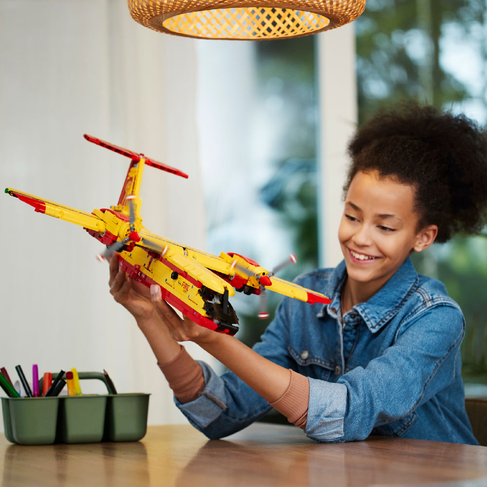 Este é um ótimo projeto para crianças e adultos curtirem juntos. Há muito para descobrir enquanto as crianças fazem as hélices girarem, levantam e abaixam o trem de pouso e assistem às flaps da cauda se moverem. As crianças vão adorar abrir a escotilha para soltar os elementos LEGO de “água” enquanto aprendem sobre como aviões de combate ao fogo apagam incêndios.