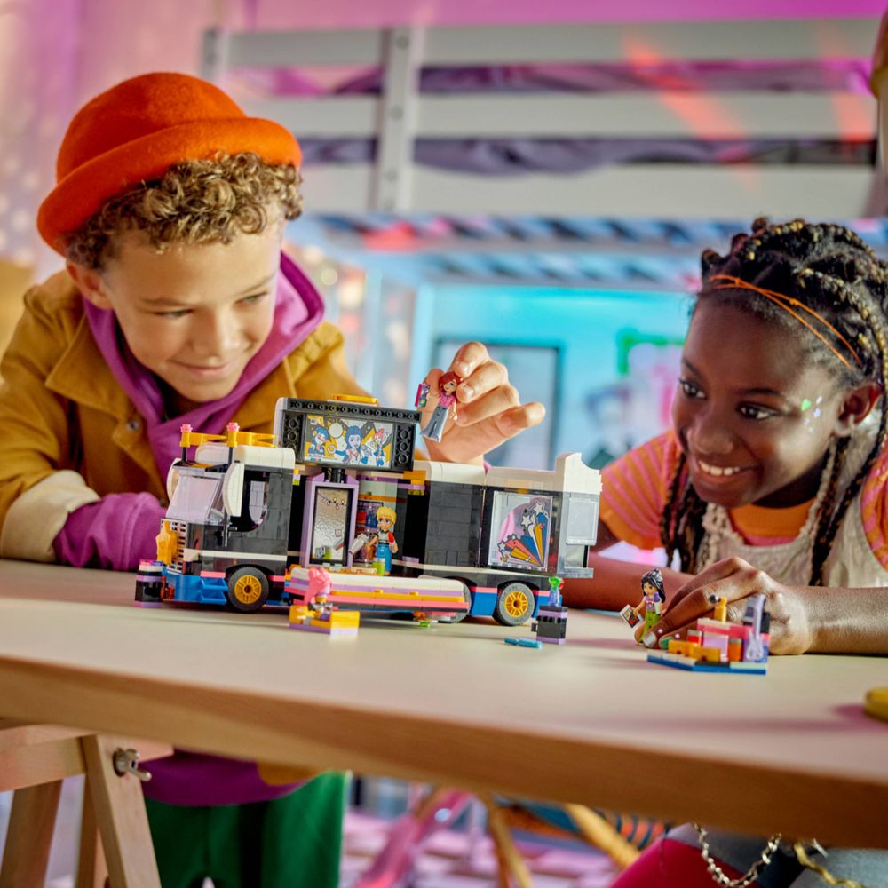Dê vida à dramatização com este conjunto de brinquedos LEGO® Friends Pop Star Music Tour Bus (42619) para meninas, meninos e crianças com mais de 8 anos. O conjunto inclui um ônibus montável e uma área de bastidores com acessórios e 4 personagens LEGO Friends.
