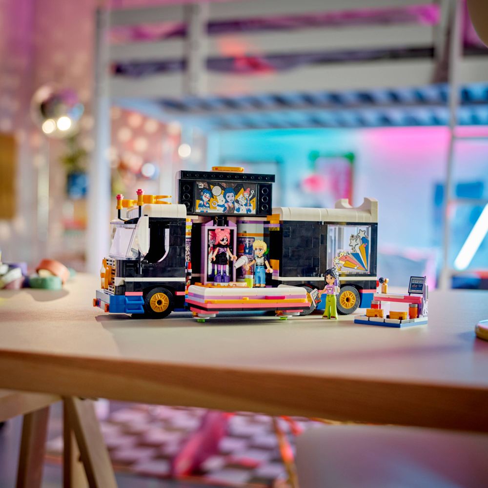Brinquedo de ônibus de turismo para dramatização musical - O conjunto LEGO® Friends Pop Star Music Tour Bus para meninas, meninos e crianças a partir de 8 anos inclui 4 personagens minibonecas e muitos acessórios