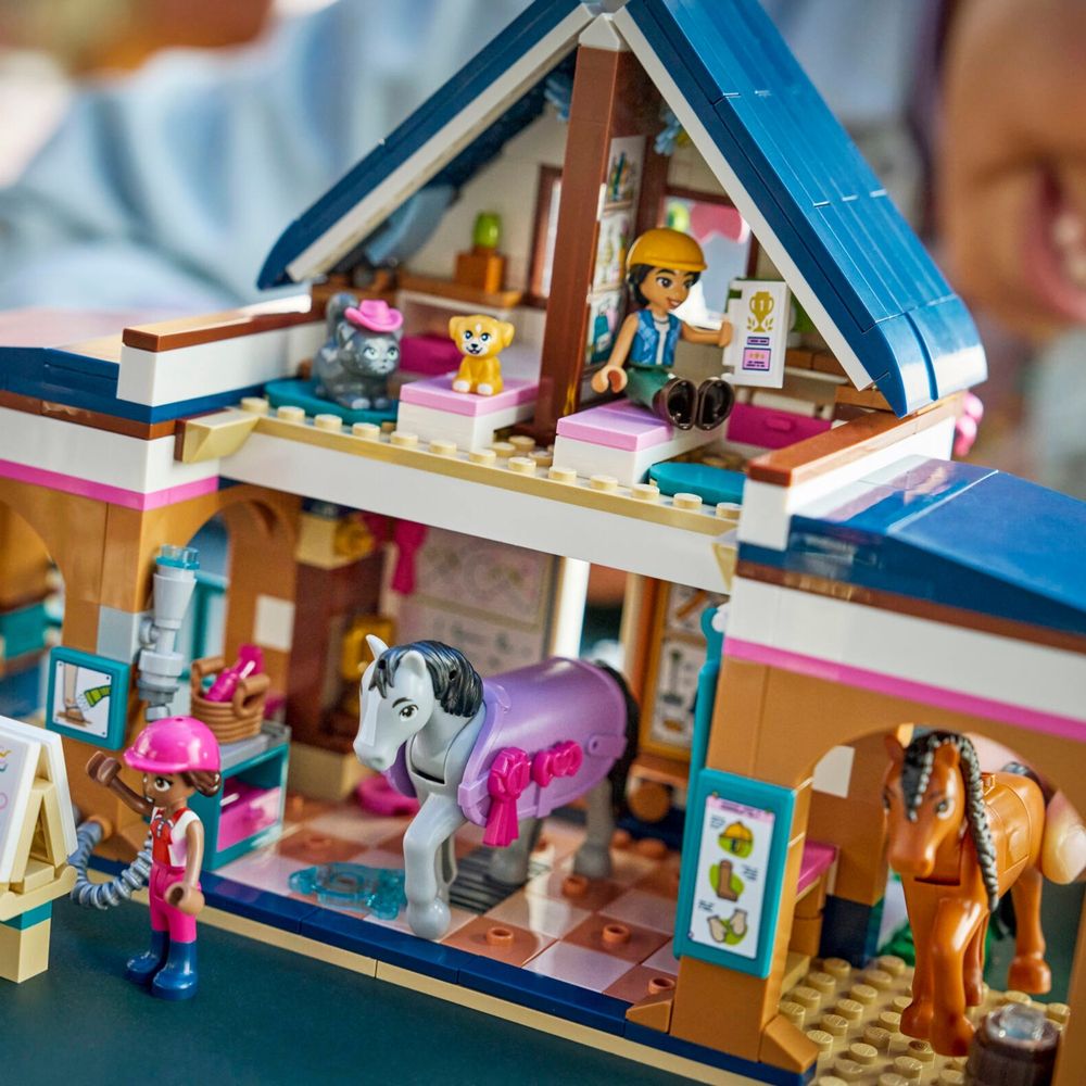CONJUNTO DE ESTÁBULO PARA CAVALOS – Crianças a partir de 7 anos podem galopar por horas em brincadeiras criativas com este detalhado Estábulo para Cavalos e Academia de Equitação LEGO® Friends (42688), que inclui 3 minibonecas, 2 cavalos e um cachorrinho.