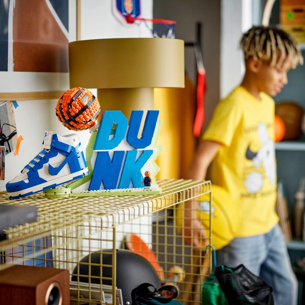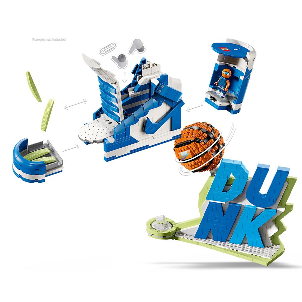 Colecionável, personalizável e cheio de atitude com o basquete, o modelo colecionável promete se tornar um dos lançamentos de tênis mais populares do ano. O conjunto inclui um Nike Dunk, um brinquedo giratório de basquete e o icônico slogan "Dunk", que os fãs de esporte podem construir, reconstruir e exibir. Escondidos dentro do modelo Nike Dunk, há compartimentos para guardar com segurança anéis de campeonato ou outros itens essenciais, além de cadarços extras para trocas de cores personalizadas. Acompanha a construção o superfã B'Ball Head – uma minifigura exclusiva que ostenta seu próprio Nike Dri-FIT e alguns mini Nike Dunks que combinam com a construção icônica.