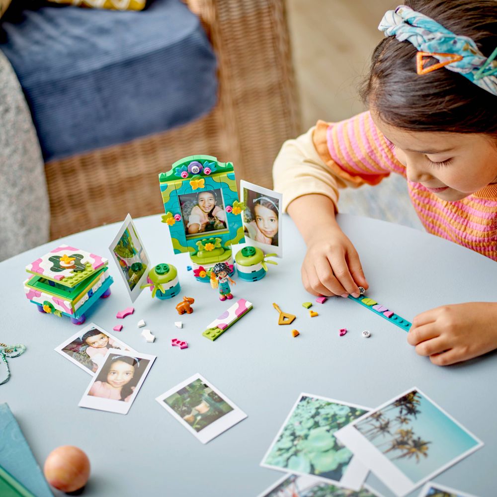 Brincadeira de design – Este conjunto de construção LEGO® permite que os fãs construam uma caixa de joias e uma moldura para fotos, depois projetem e decorem essas peças, junto com a pulseira vestível, e redecorem-nas a qualquer momento