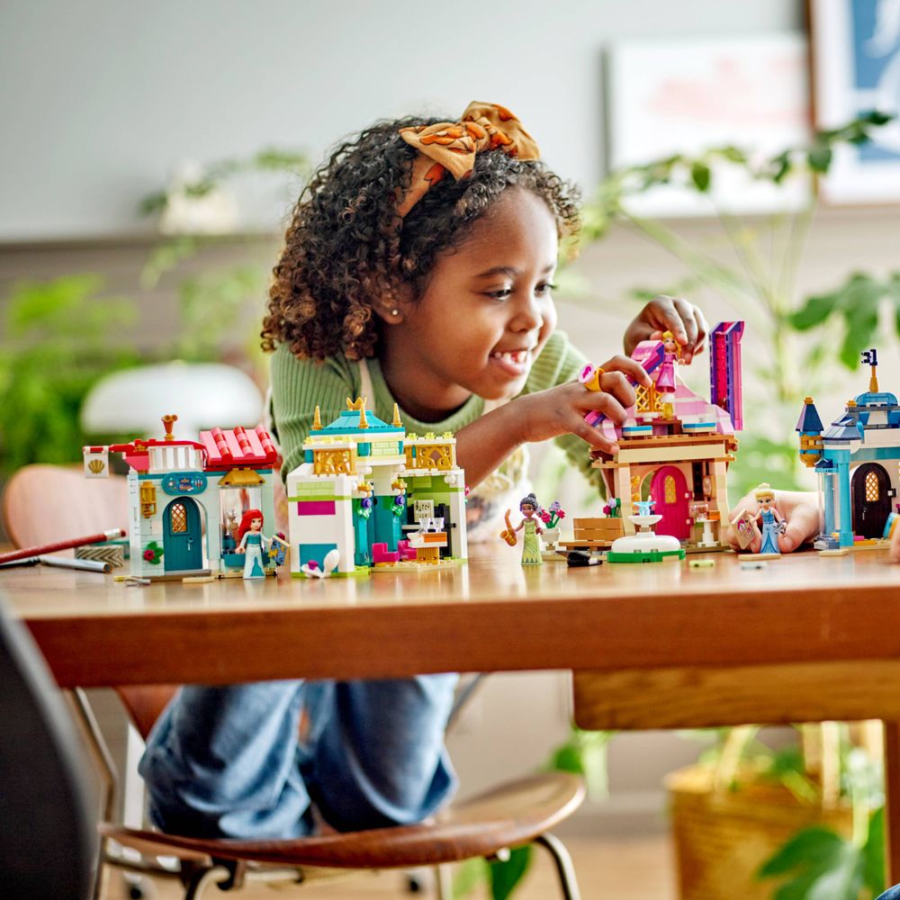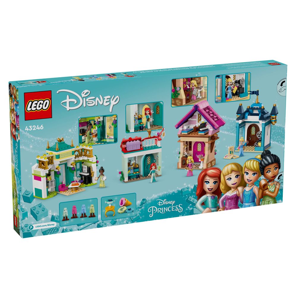 Cative e entretenha os fãs das Princesas Disney e crianças a partir de 6 anos com este detalhado conjunto de construção LEGO® | Disney Princess: Disney Princess Market Adventure (43246). A caixa contém 4 edifícios de brinquedo para construir, um com um pequeno espaço de arrumação no topo e um modelo pequeno com vaso, banco e fonte. Também inclui figuras de minibonecas LEGO | Disney de Tiana, Aurora, Cinderela e Ariel, além de 2 anéis colecionáveis ??com 4 decorações que podem ser trocadas continuamente. As crianças podem criar uma aventura no mercado e depois encenar histórias intermináveis ??ou imaginar novas aventuras com muitos acessórios para começar a brincar.