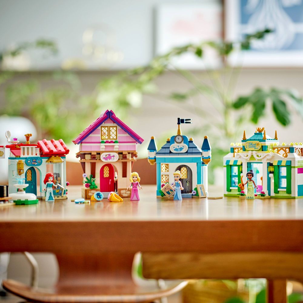 Possibilidades imaginativas – Inclui 4 edifícios, uma área menor com vaso de flores, banco e fonte, além de figuras de minibonecas Ariel, Aurora, Cinderela e Tiana LEGO® | Disney Princess