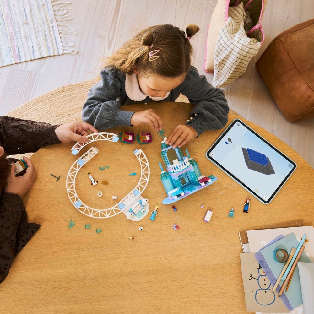 CASTELO COM TRILHO E TRENÓ – Este conjunto de construção Castelo de Gelo e Aventura na Neve da Elsa (43281) inclui 7 personagens LEGO® | Disney Frozen, um castelo de 2 andares, trilho com 3 trenós, escadas e muito mais.