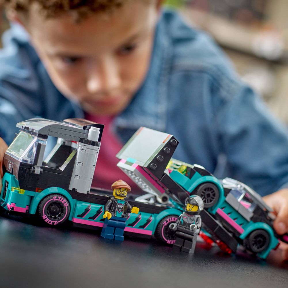 Transportador de carros de brinquedo – Os fãs de carros de corrida e caminhões podem desfrutar de horas de diversão com este conjunto de construção LEGO® City Race Car e Car Carrier Truck para maiores de 6 anos