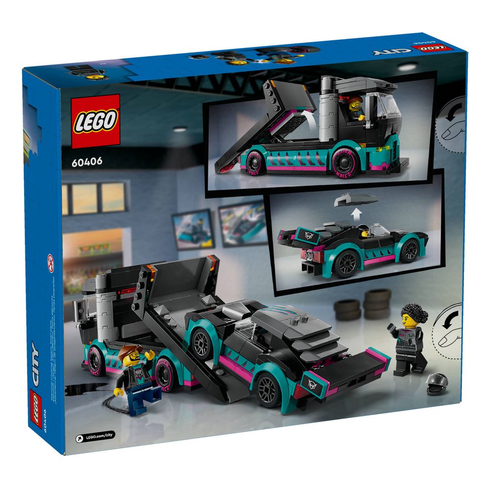 Aumente a emoção com este conjunto LEGO® City Carro de Corrida e Caminhão Transportador de Carros (60406), um presente perfeito para alimentar o amor das crianças por carros e caminhões de brinquedo. Projetado para maiores de 6 anos, este conjunto apresenta um caminhão de corrida com uma rampa de carregamento funcional e um carro de corrida incrível com suspensão rebaixada e asas alargadas. O conjunto também inclui minifiguras de pilotos de corrida e caminhoneiros para dramatizar histórias e aventuras divertidas.