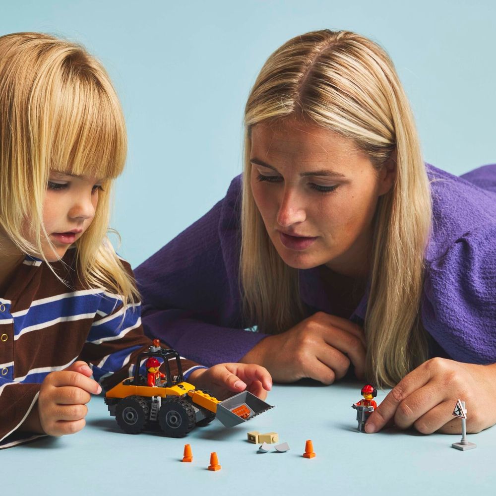 Veículos de construção de brinquedo LEGO® para crianças que adoram brincar – As crianças podem montar a placa, usar os cones para marcar a área de trabalho e usar o balde da máquina para recolher os escombros de LEGO
