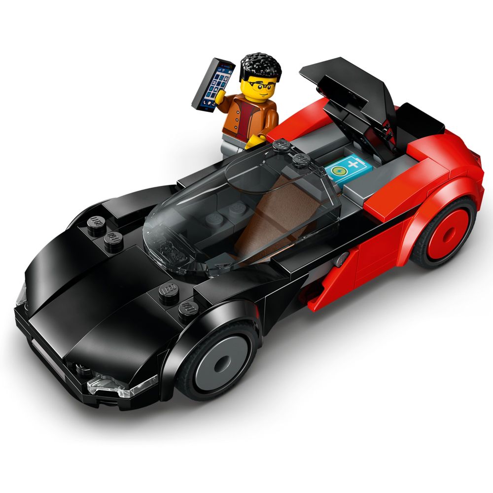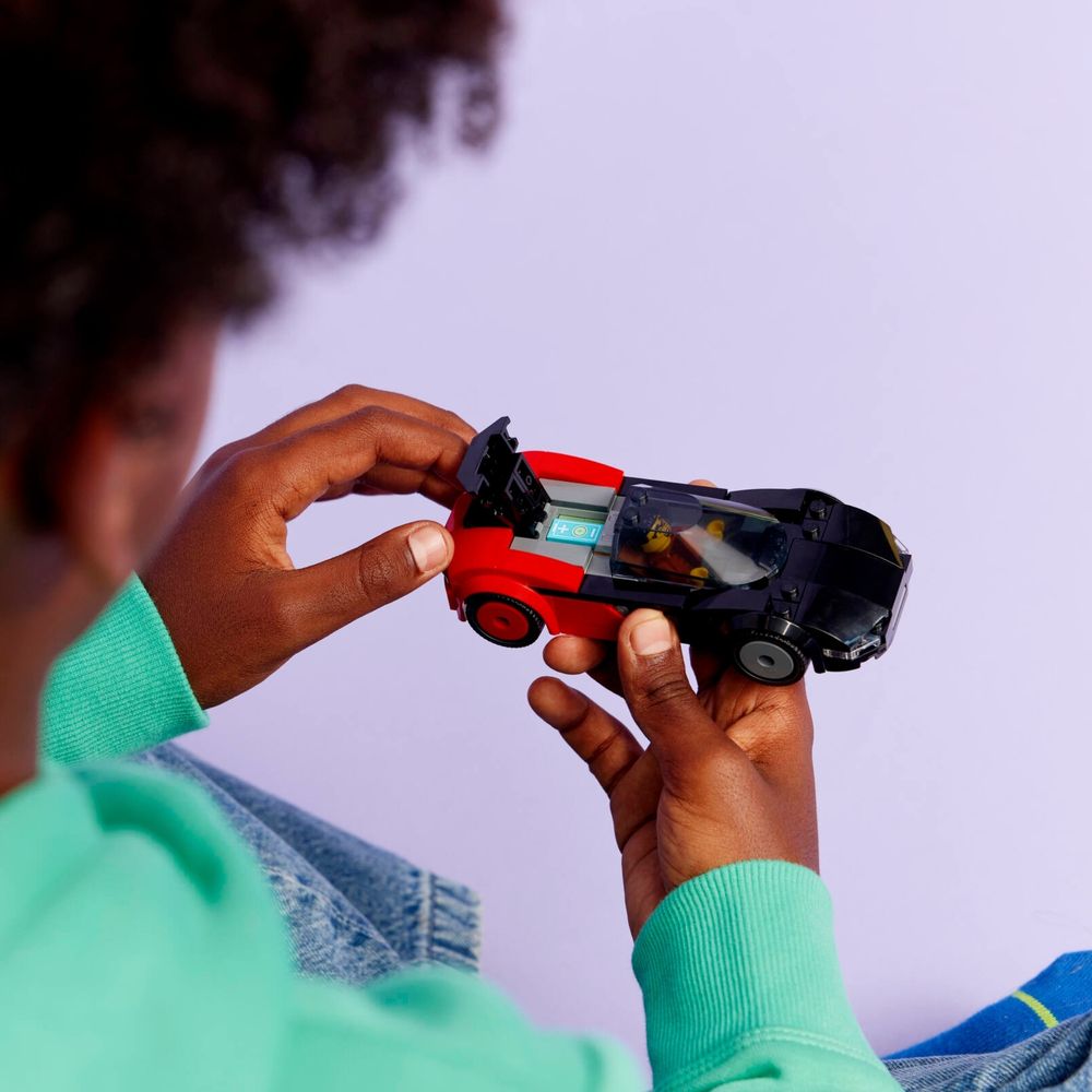 IGUALZINHO AO DE VERDADE – Levante a tampa traseira do pequeno carro esportivo preto e vermelho para acessar o compartimento da bateria e coloque o minifig do motorista ao volante para horas de pura adrenalina!