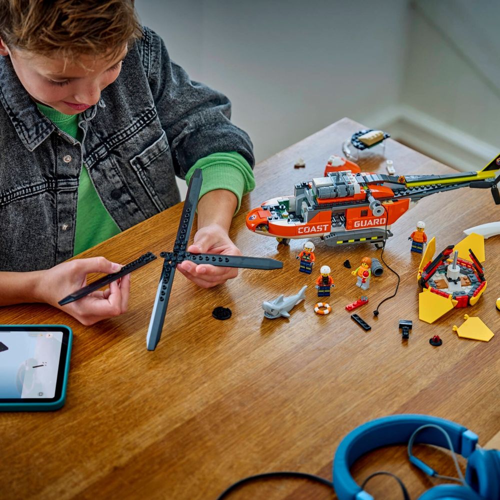 O QUE VEM NA CAIXA – Inclui tudo o que as crianças precisam para construir um helicóptero de resgate marítimo detalhado, cápsula de resgate, além de minifiguras de piloto, civil e 2 guarda-costas, e uma figura de tubarão.