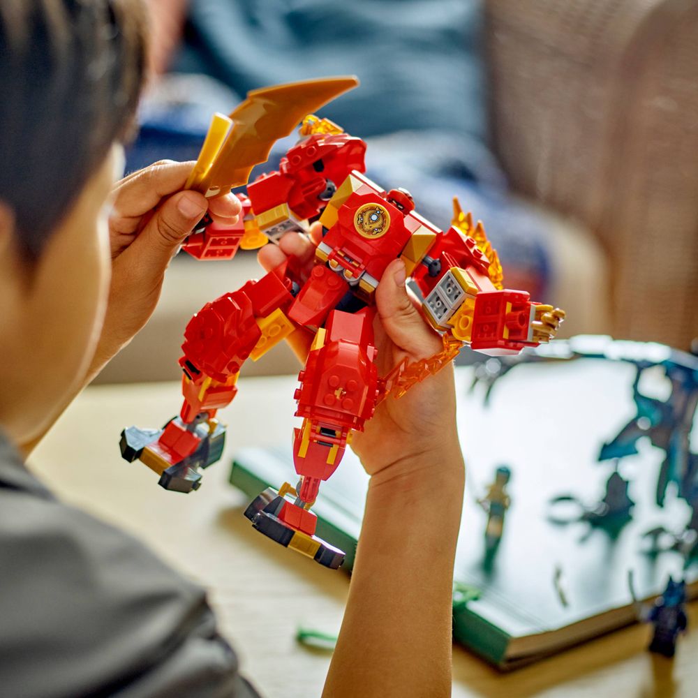 Crianças a partir de 7 anos podem recriar histórias da 2ª temporada de NINJAGO® Dragons Rising com o brinquedo ninja Kai’s Elemental Fire Mech (71808). O mech tem braços e pernas ajustáveis ??que podem ser inclinados e torcidos em posições de batalha dramáticas, um cockpit para a minifigura ninja e um grande acessório de espada dourada para dramatizações de batalhas contra o Wolf Mech.