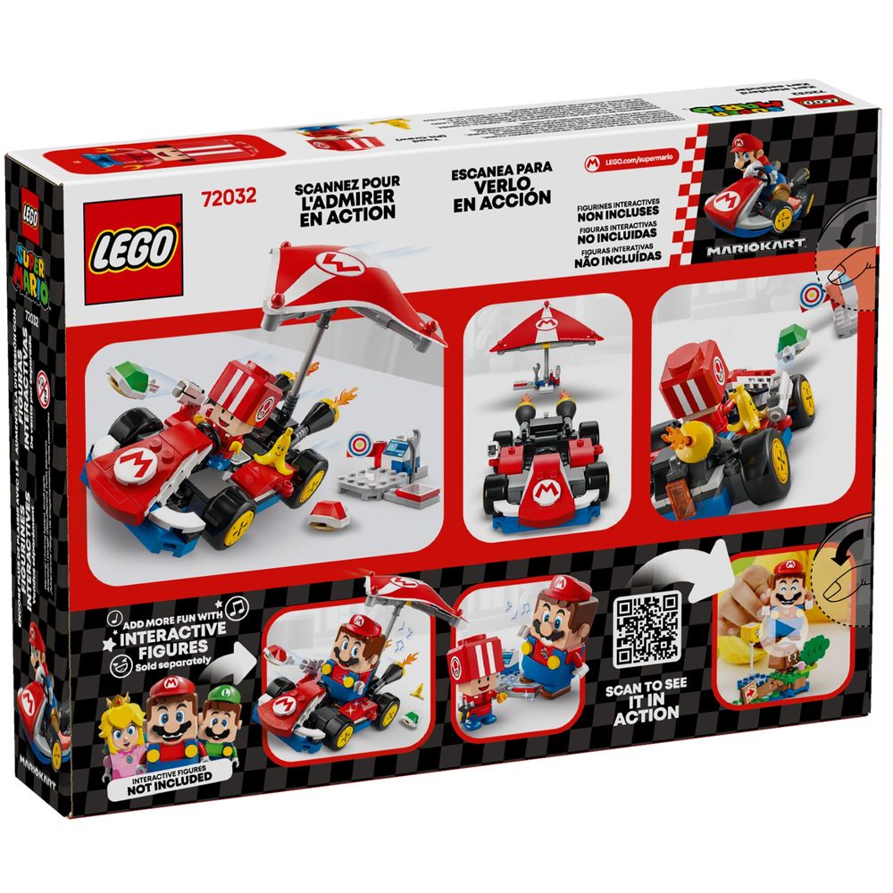 Jogo interativo – Coloque LEGO® Mario™, LEGO® Luigi™ ou LEGO® Peach™ (figuras não incluídas) no kart para efeitos sonoros/visuais e pise na Action Tag da estação de trabalho para outras reações digitais