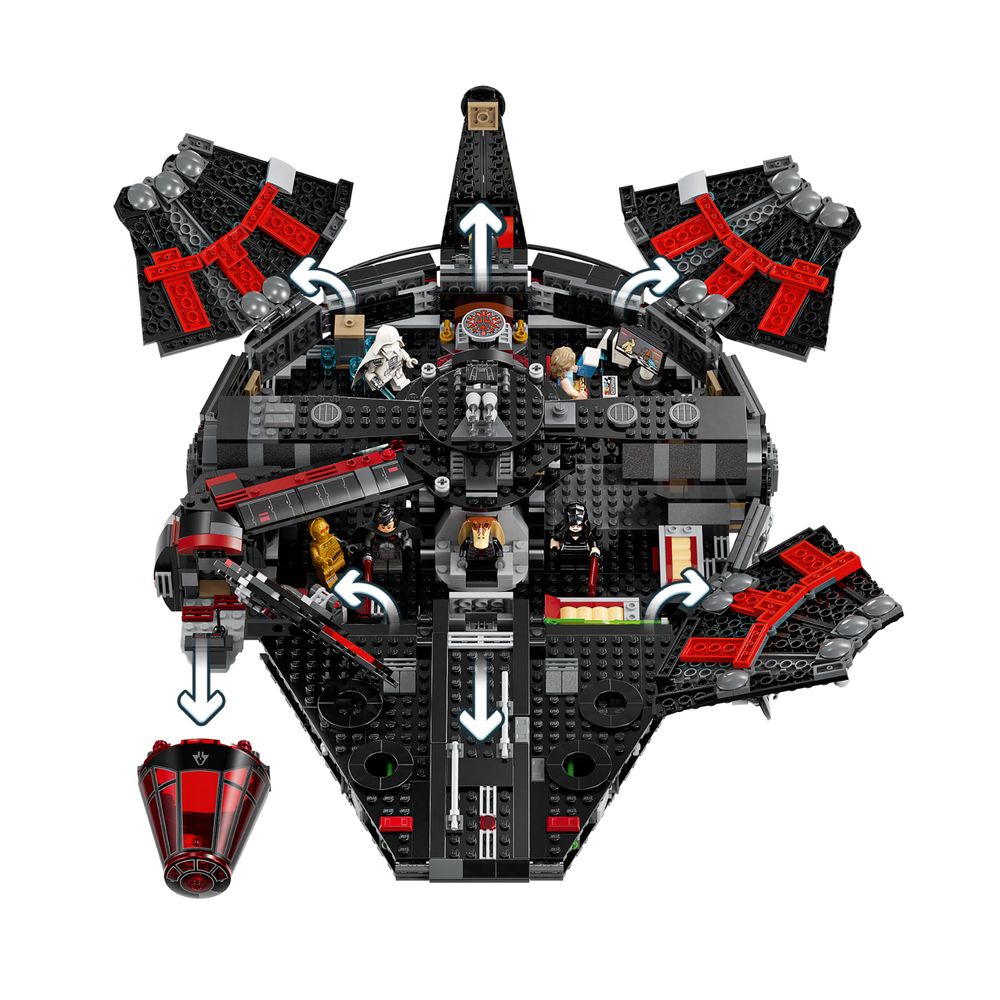 Fácil acesso – Abra os painéis superiores para brincar com o interior detalhado, que inclui um trono removível para Darth Jar Jar, centro de comando, hiperdrive, beliches, área de entretenimento e uma cela de prisão