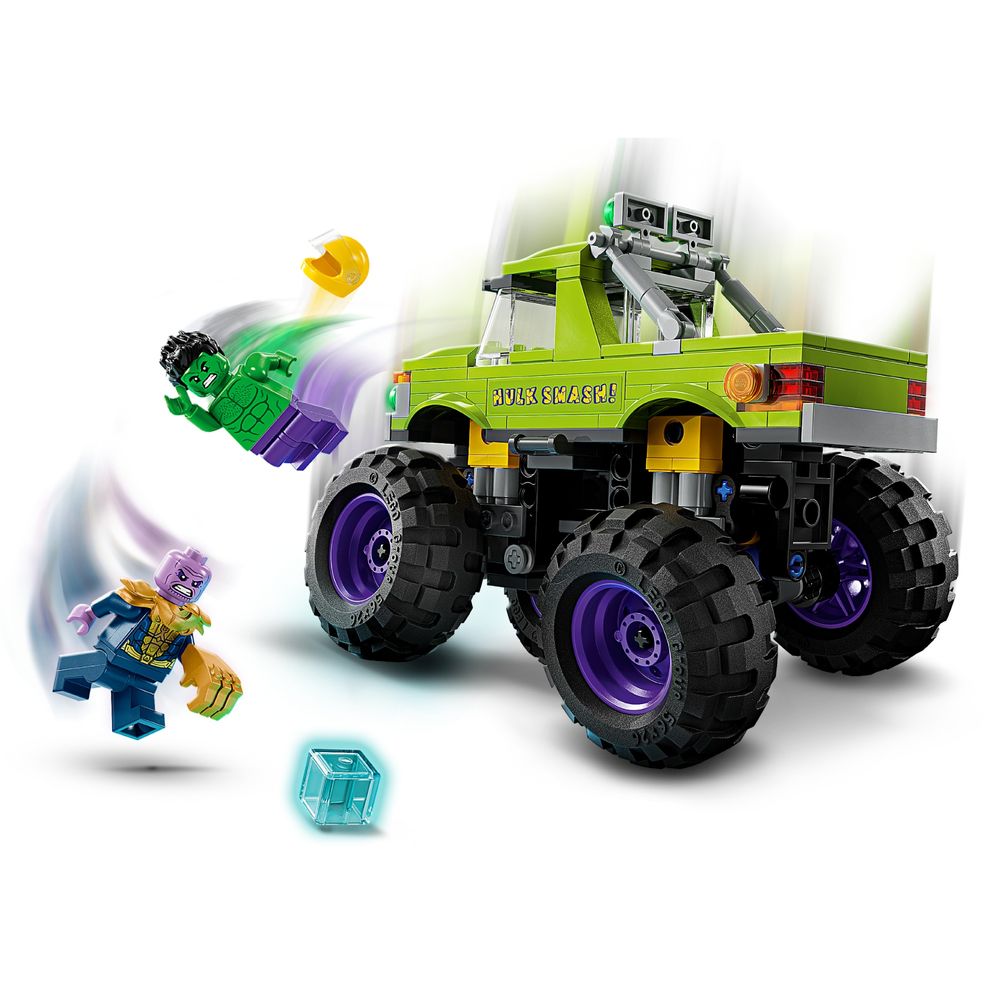Este caminhão pesado LEGO | Marvel montável apresenta uma minifigura do Hulk com um capacete removível e uma minifigura do Thanos com um Tesseract e Manopla do Infinito. O caminhão do Super-herói apresenta uma cabine de elevação, fornecendo acesso ao assento do motorista, com espaço para a minifigura do Hulk. O exterior é verde com 'Hulk Smash!' e decorações do rosto do Hulk. Com grandes rodas giratórias, um design robusto e suspensão com absorção de choque, o mega caminhão pode lidar com as missões mais difíceis. Para maior diversão digital, os construtores podem aumentar o zoom, girar modelos em 3D e acompanhar seu progresso usando o divertido e intuitivo aplicativo LEGO Builder. O conjunto contém 229 peças.