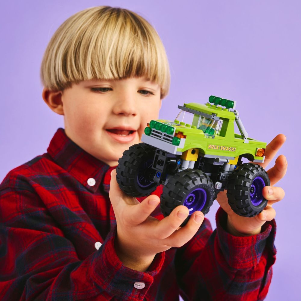 Caminhão off-road montável – O robusto caminhão Super Hero tem um assento do motorista com espaço para a minifigura do Hulk e grandes rodas giratórias com suspensão que absorve choques