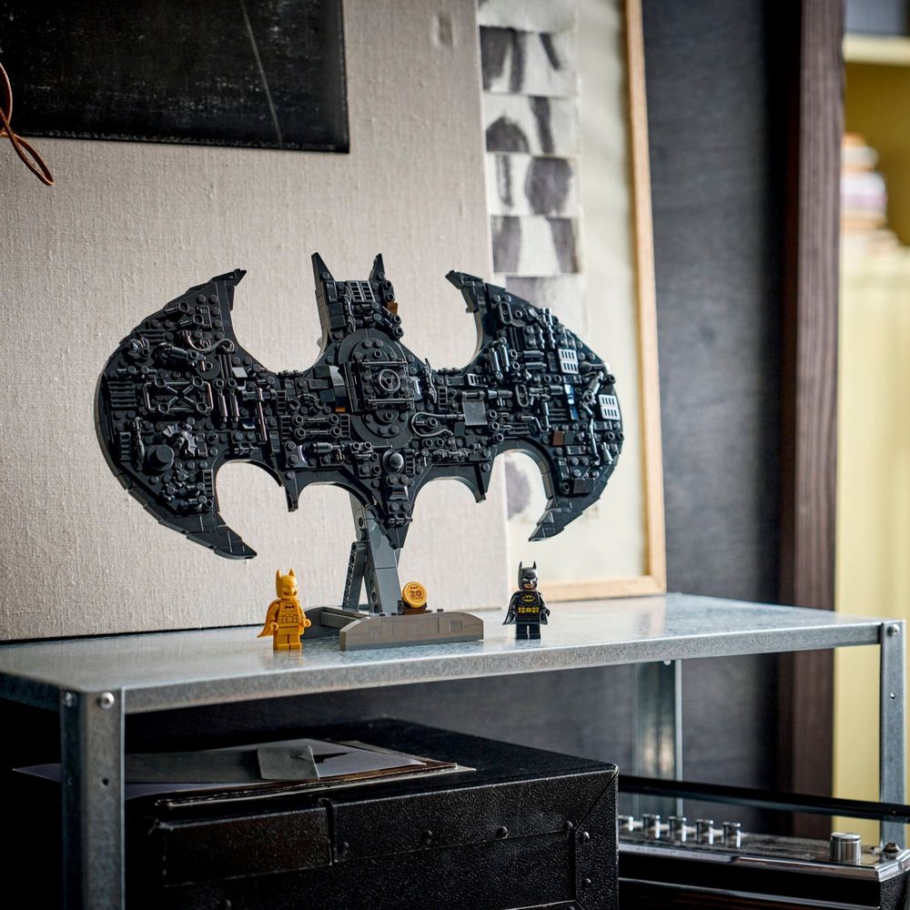 Exiba o Bat-Sinal em sua base ou preso na parede usando o suporte embutido. O modelo é decorado com itens conhecidos do Universo DC que podem ser removidos e reposicionados, incluindo Batarangs™ e o martelo Harley Quinn™. O conjunto vem com uma minifigura do Batman dourada e uma moeda de comemoração do aniversário, além de uma minifig clássica do Batman que pode caber em uma abertura de porta central no modelo, projetada para parecer com a porta do Cofre da Batcaverna™. O conjunto contém 678 peças.