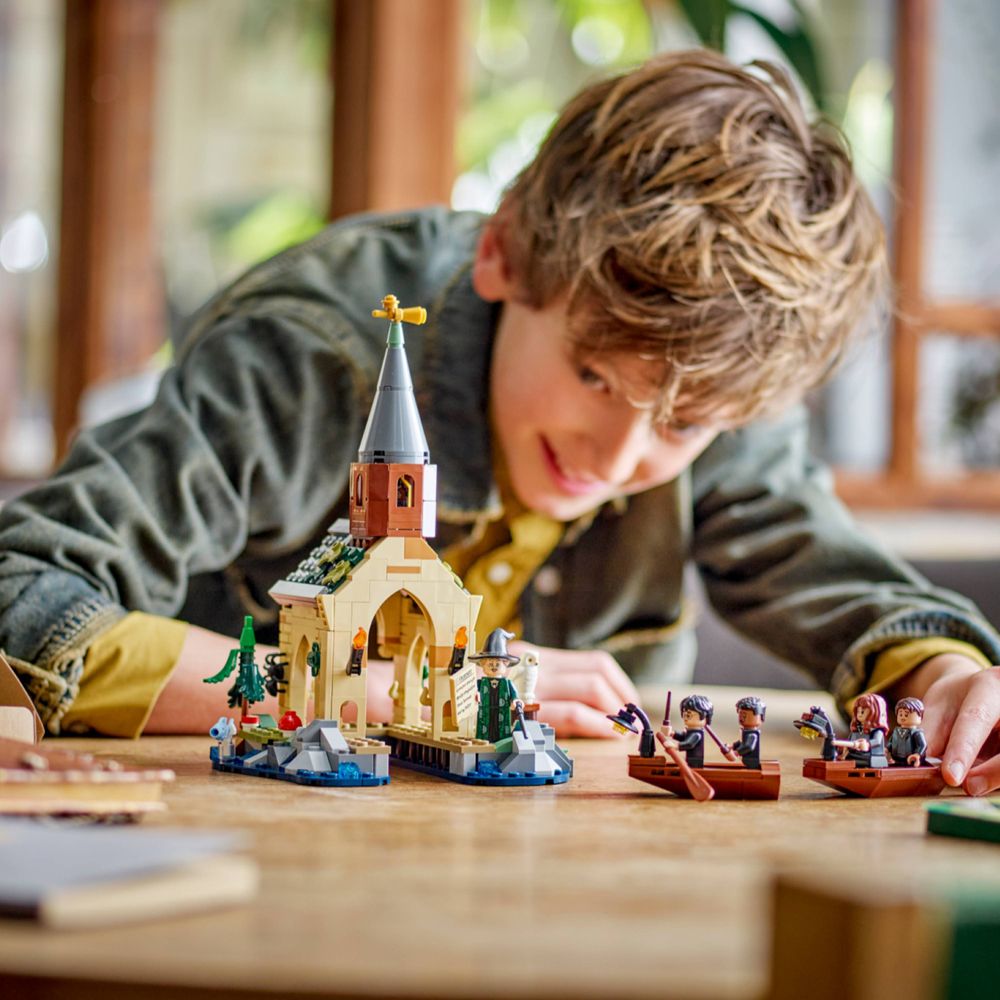 Conjunto de brinquedos de fantasia para aventuras montáveis ??– Deixe as crianças recriarem a cena icônica de Harry Potter e a Pedra Filosofal™, onde Harry Potter™ e seus amigos chegam pela primeira vez ao Hogwarts™ Castle Boathouse