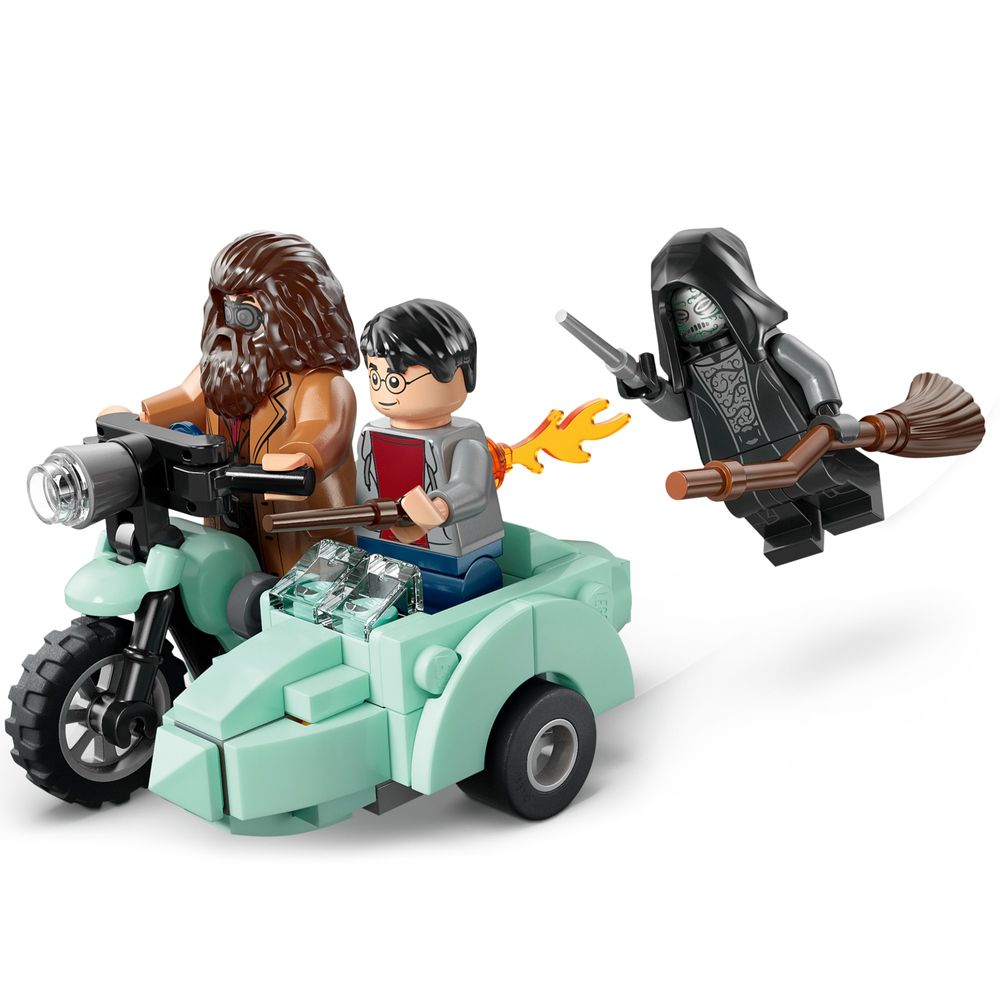 4 minifiguras LEGO® HARRY POTTER™ – Recrie aventuras e histórias com Harry Potter, Rubeus Hagrid™ (usando seus icônicos óculos de motoqueiro) e 2 Comensais da Morte.