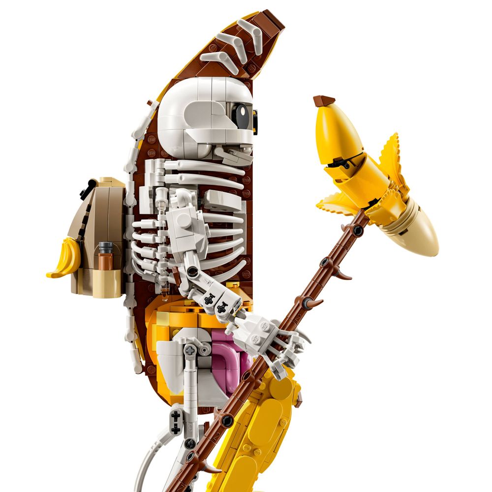 Os fãs de Fortnite mergulharão em uma aventura fora da tela enquanto montam a iteração construída em blocos de Peely Bone, que é meio banana e meio esqueleto. Eles vão se deliciar descobrindo os braços e pulsos móveis do brinquedo de jogo, bem como seus acessórios legais, que incluem uma picareta Peely Pick, um lançador de tinta e um acessório para as costas Banana Bag.