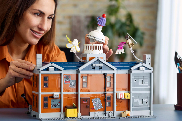 Pronto para horas de dramatização, os recursos interativos do conjunto incluem paredes e portas deslizantes e um telhado que pode ser destruído ativando um interruptor.