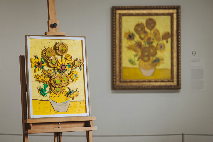 “Decidir quais cores usar foi um dos aspectos mais desafiadores deste modelo”, diz Stijn. “Van Gogh disse que pintou os Girassóis com 'três tons de amarelo e nada mais'. Ter uma paleta de cores seletiva é um ponto forte, pois cria uma linguagem coesa. No entanto, também pode ser limitante quando você está tentando replicar uma obra de arte existente. Meu objetivo como designer muda de tentar usar exatamente as cores certas para encontrar um equilíbrio de cores e harmonia que imite a obra de arte original. Claro, também tivemos a liberdade de brincar com as sombras naturais criadas pelos tijolos, criando um gradiente de cor.”