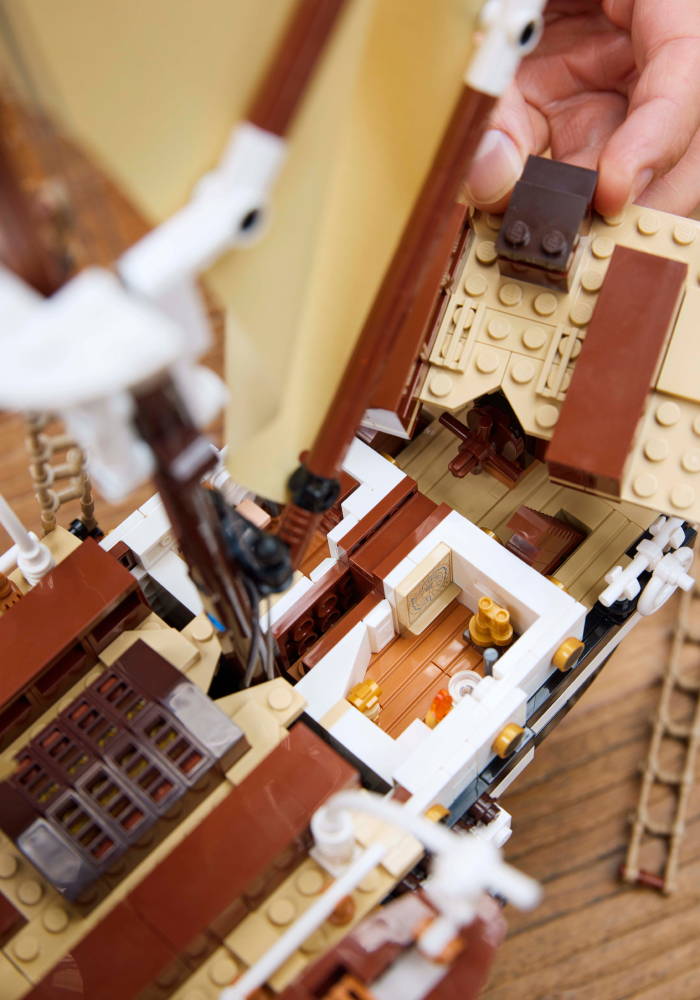 “O desafio aqui era projetar uma pequena caixa de engrenagens LEGO Technic™ e escondê-la dentro da cabine externa do navio, onde o volante está preso”, diz Hans. “A parte traseira do navio é uma área muito movimentada abaixo do convés, então a última coisa que eu queria era criar um buraco para um eixo descendo da caixa de engrenagens. Mas eu simplesmente tinha que fazer isso, pois era muito importante dar ao navio um leme funcional.”