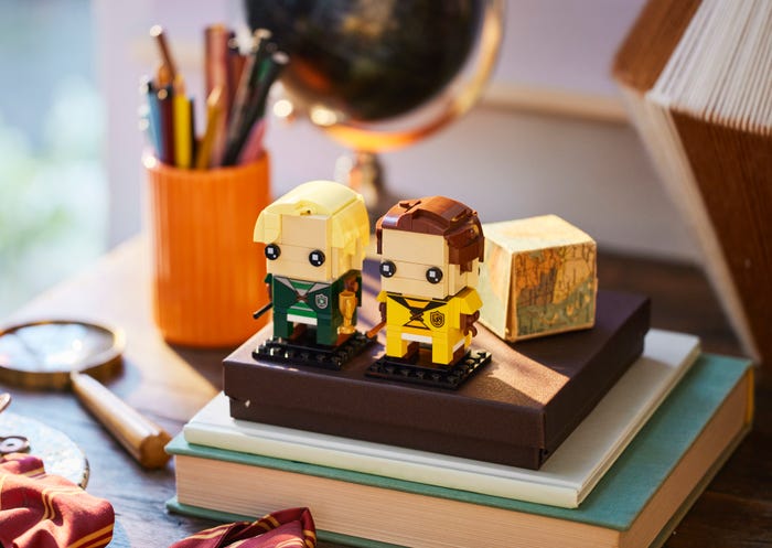 Este conjunto de exibição traz o inimigo loiro de Harry, Draco Malfoy™, e o rival do bruxinho do Torneio Tribuxo, Cedrico Diggory. Os personagens estão vestidos com seus uniformes das casas Sonserina™ e Lufa-Lufa™, e o conjunto vem ainda com duas vassouras e a taça das casas.