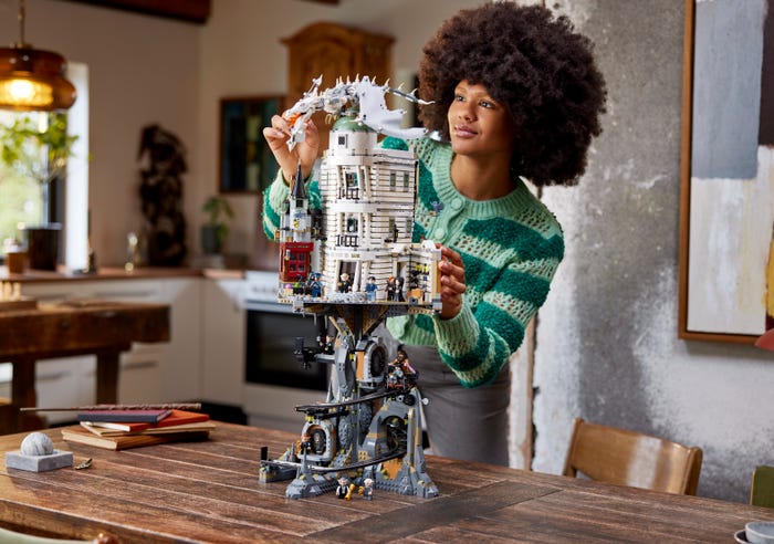 Um dos primeiros lugares mágicos que Harry visitou foi Gringotes, o banco dos bruxos. Este conjunto para colecionadores de 4.803 peças recria o opulento saguão do banco e seu mezanino, além de um dos cofres na parede. Também é possível construir os trilhos em espiral para o carrinho, e há um mecanismo que para o carrinho em cada um dos três cofres subterrâneos — inclusive no de Belatrix, que guarda uma surpresa em seu interior.