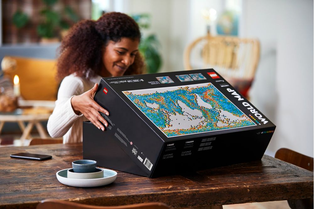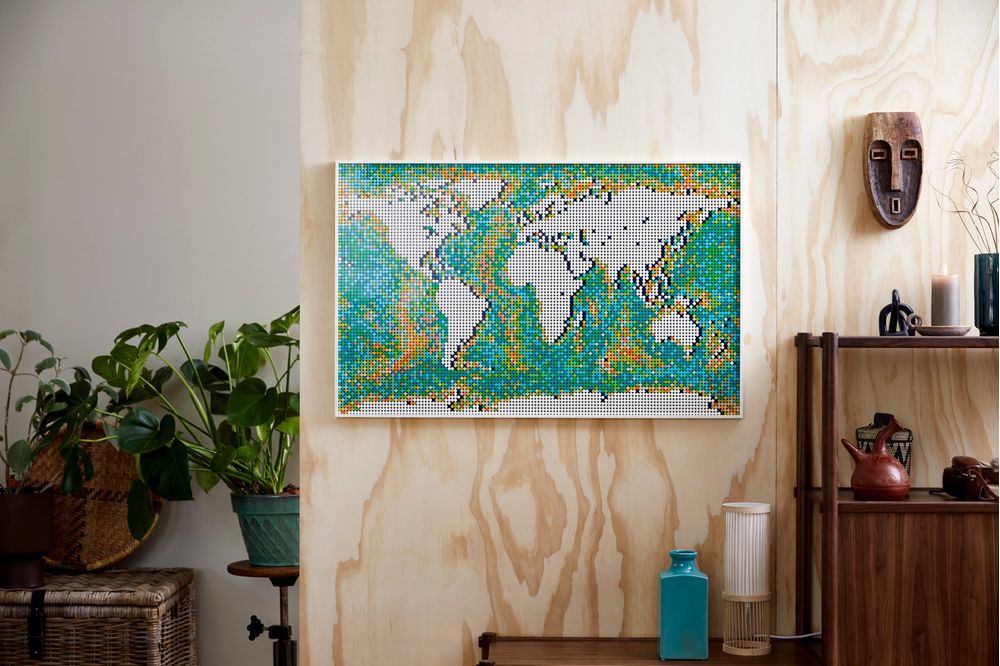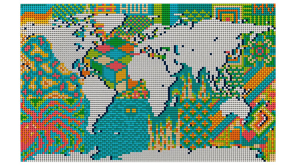 Alguma vez desejou criar seu próprio mapa? Agora você pode com este enorme kit LEGO® Art Mapa do Mundo (31203). É o maior conjunto LEGO até hoje e pode ser usado para fazer e exibir 1 de 3 mapas vibrantes. Esta reinterpretação de um mapa do mundo clássico permite-lhe expor a sua criatividade. Pode usar a inspiração incluída para construir o mapa, ou personalizar os oceanos para dar ao mapa um toque pessoal e reconstruir o mundo. As massas continentais podem ser movidas para fazer reconvergir o mapa em 1 de 3 secções do mundo. Personalize-o ainda mais com pinos coloridos construídos com peças para realçar os lugares significativos.