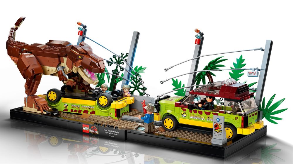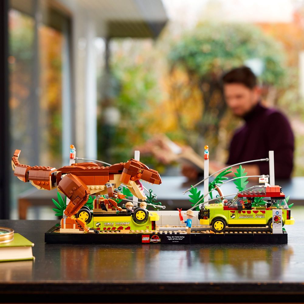 • 4 minifiguras LEGO® e um T. rex – Alan Grant, Ian Malcolm, Tim Murphy e Lex Murphy, e também uma figura de T. rex ajustável para dar vida à cena.